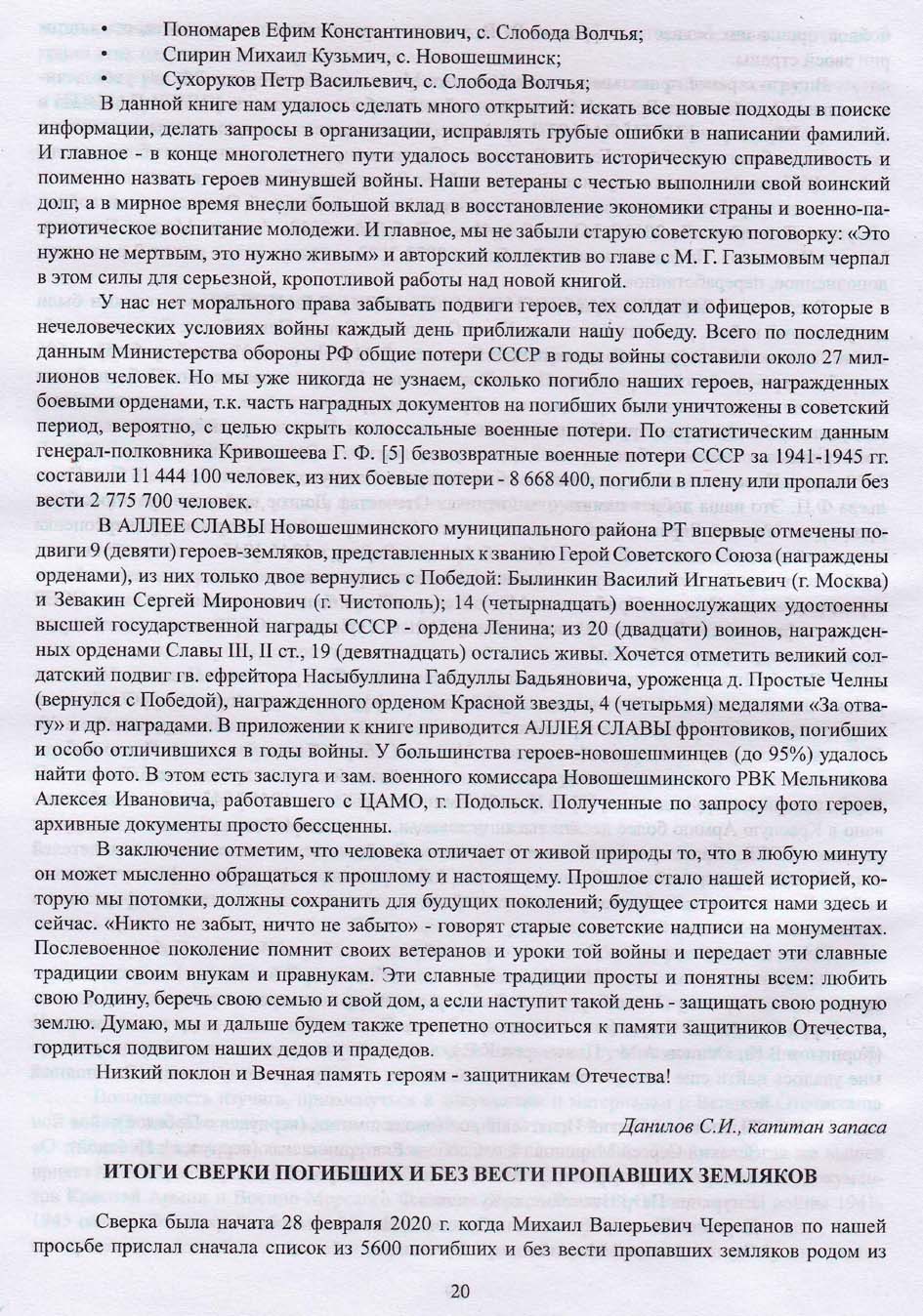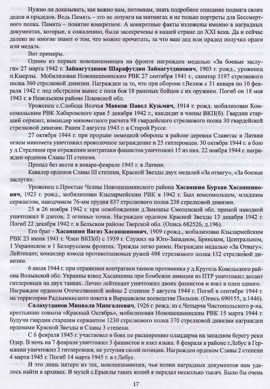 В приложениях мы дали алфавитный список погибших земляков и награжденных орденами и медалями (316 чел.); общий алфавитный список вновьнайденных погибших (437), разбив его по населенным пунктам. В том числе и те, кто был призван Новошешминским РВК из областей, краев, городов бывшего СССР, районов Татарский АССР.