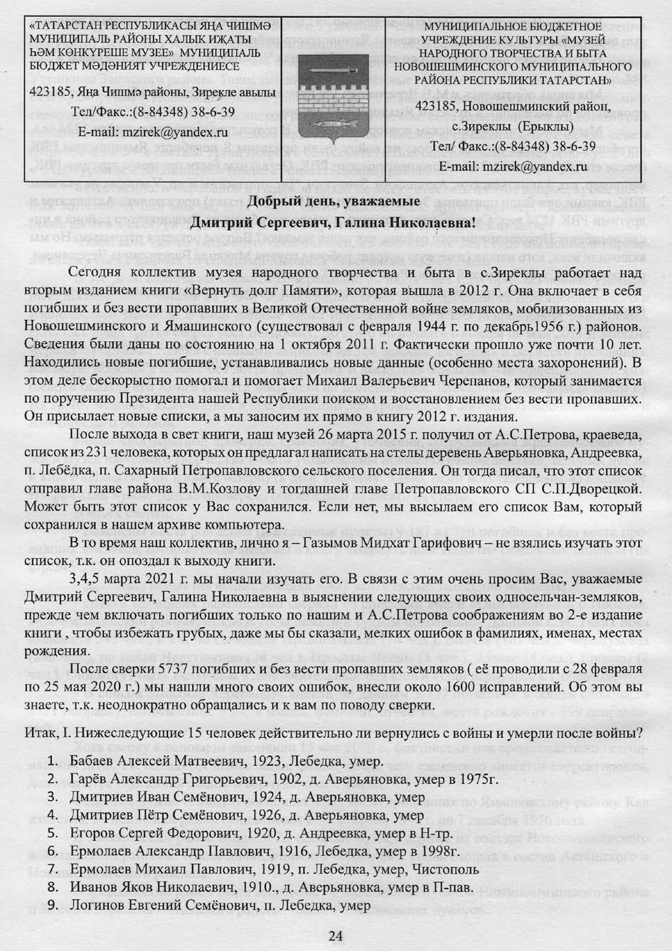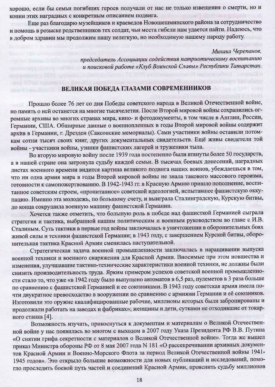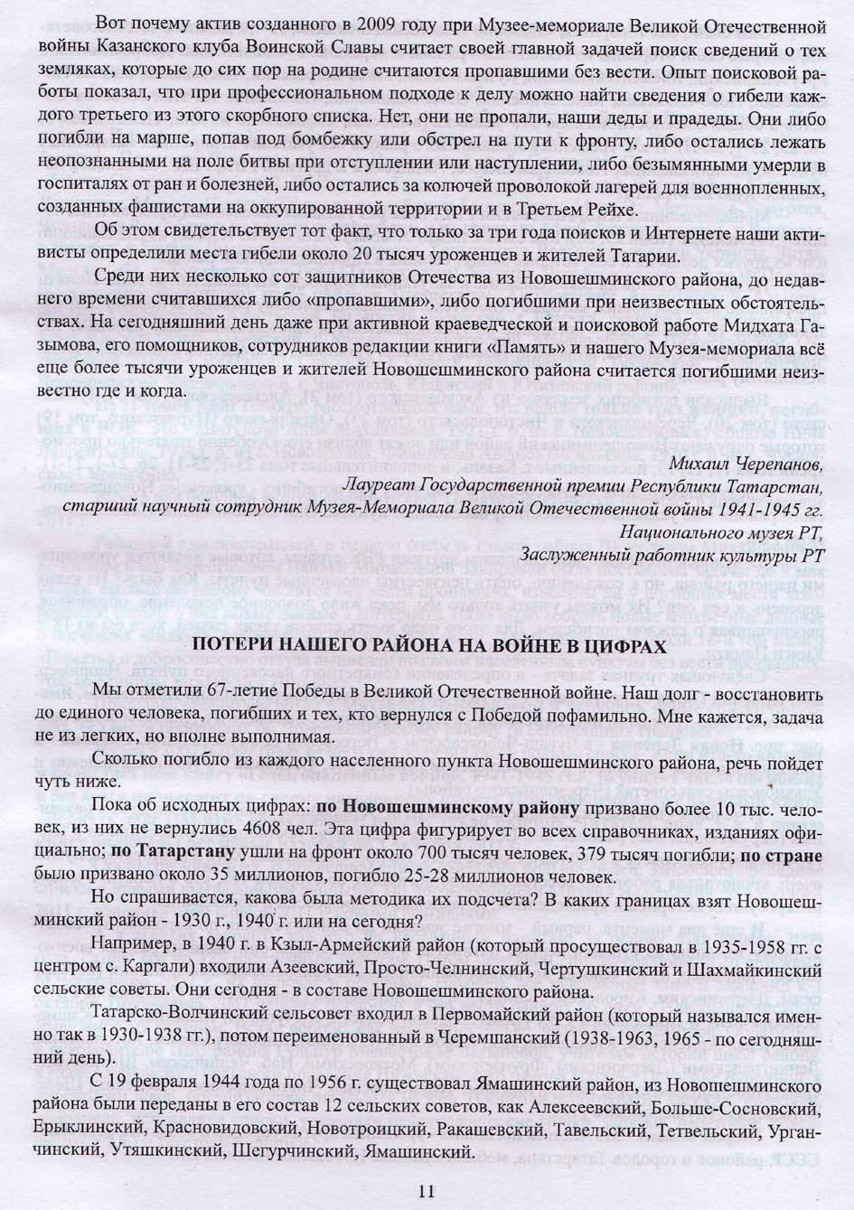 Списки погибших и без вести павших по Новошешминскому (в границах 1940 г.) и Ямашинскому району (1949-1956 гг.) представлял по нашей просьбе Михаил Черепанов сразу после выпуска книги «Вернуть долг Памяти», т.е. с 2014 г. по сегодняшний день. В общей сложности мы от него получили списки более чем на 7000 человек.