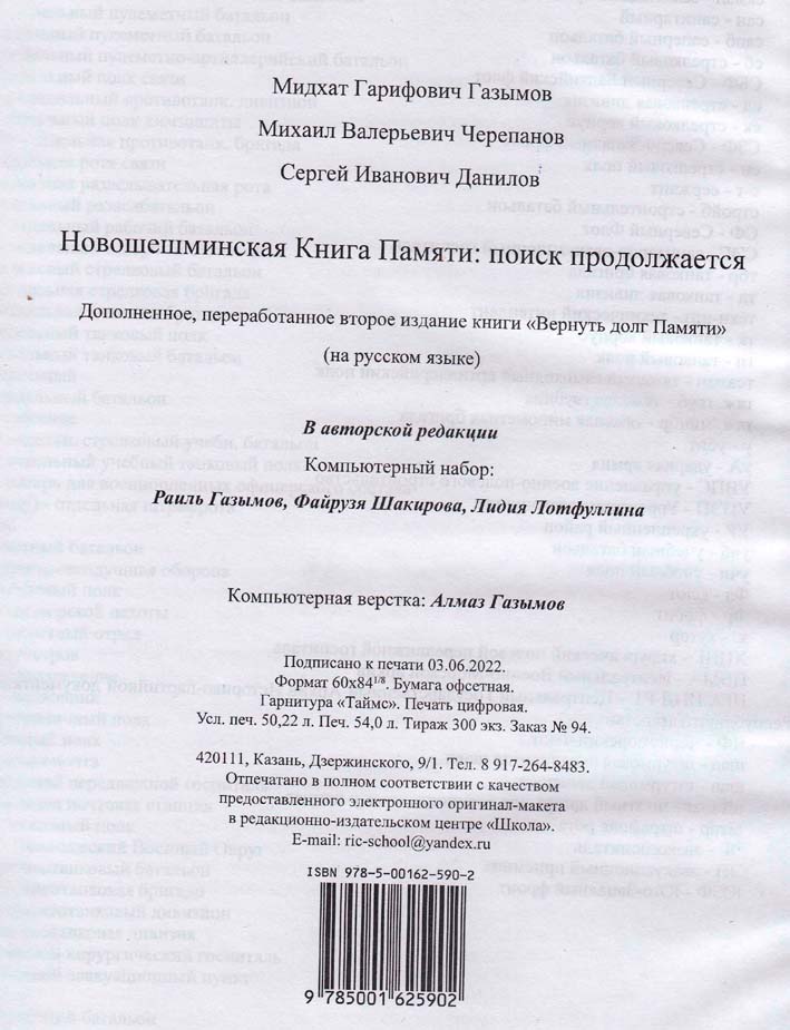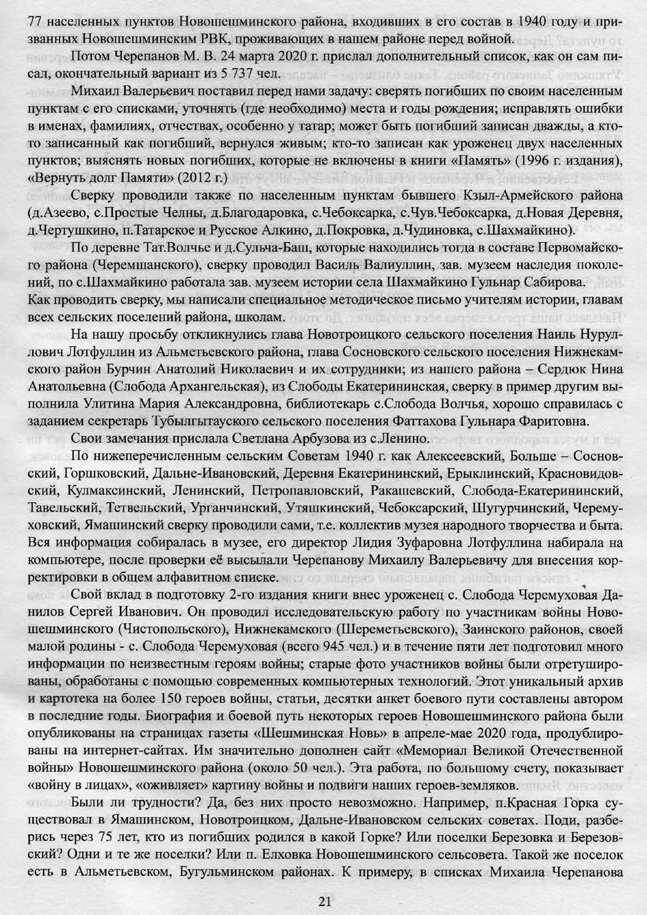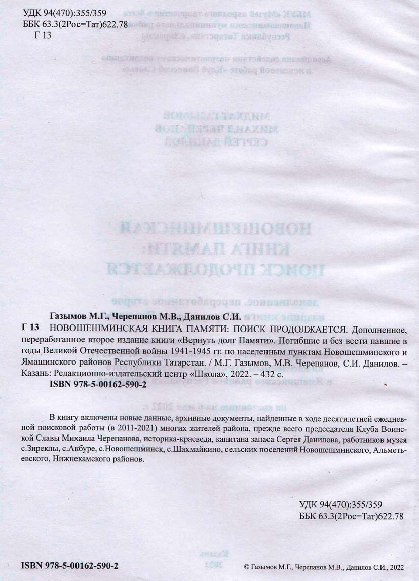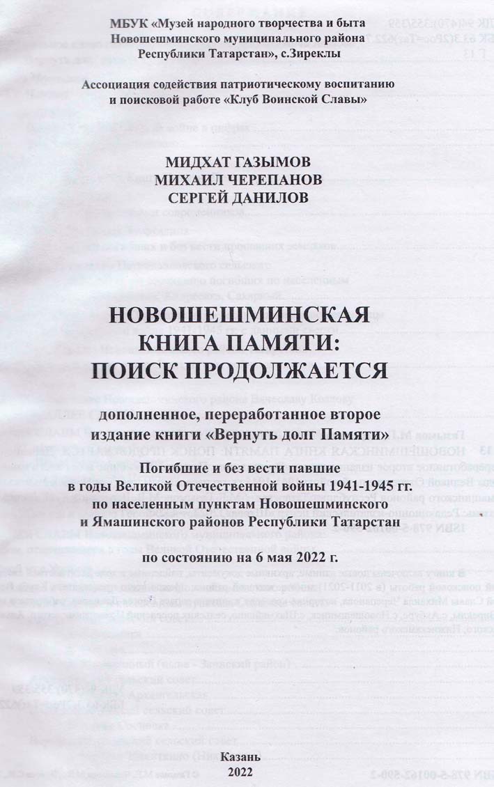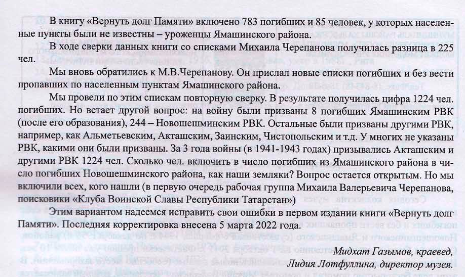 В Книгу «Память», выпущенную в 1996 (том 18, Нижнекамский и Новошешминский районы), по нашему району были включены 4608 погибших. В ходе поисковых работ эта цифра в 2012 г. увеличилась на 1650 чел., т.е. в книгу «Вернуть долг Памяти» вошли 6258 погибших по Новошешминскому району, и по Ямашинскому - 783. В книге «Новошешминской Книга Памяти: поиск продолжается» эти цифры составили 6578 чел. (на 320 больше), по Ямашинскому району – 1225 (на 942 чел. больше). Это результат ежедневной поисковой работы. Даже после выхода этого издания в июне 2022 г. Михаил Черепанов прислал еще фамилии и данные на 5 погибших, к сожалению, они не вошли в книгу.