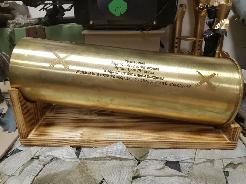 Артиллерия 291 МСП поздравили Ильдуса Фатиховича с днём рождения и приподнесли сувенир, сделанный из гильзы снаряда, с поздравительной надписью.
