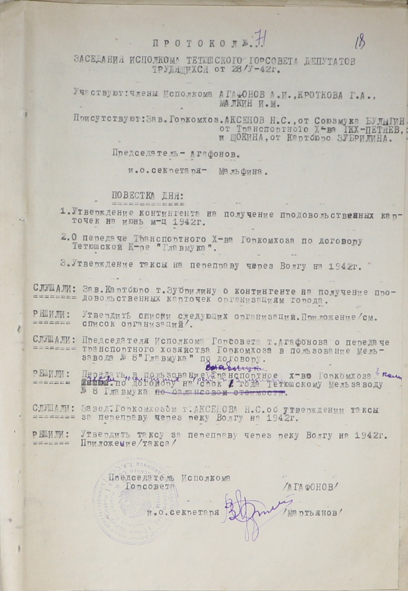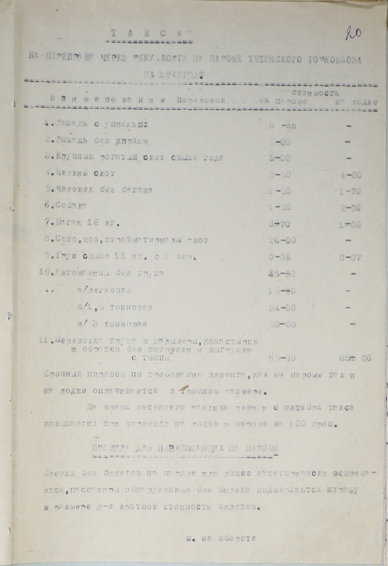 На заседании исполкома Тетюшского горсовета от 28 мая 1942 года № 71 обсуждался следующий вопрос: «Об утверждении таксы на переправу через Волгу на 1942 год».