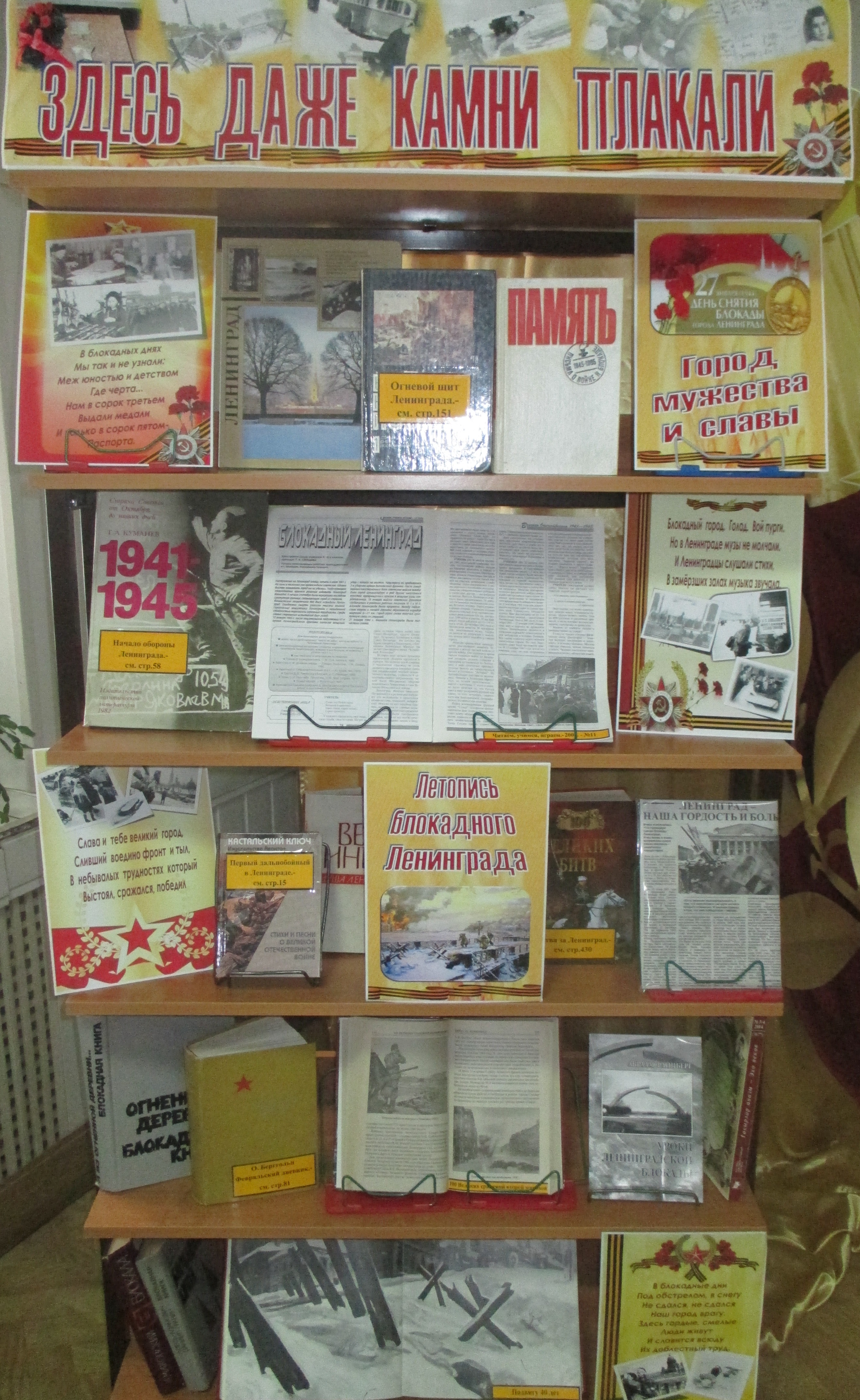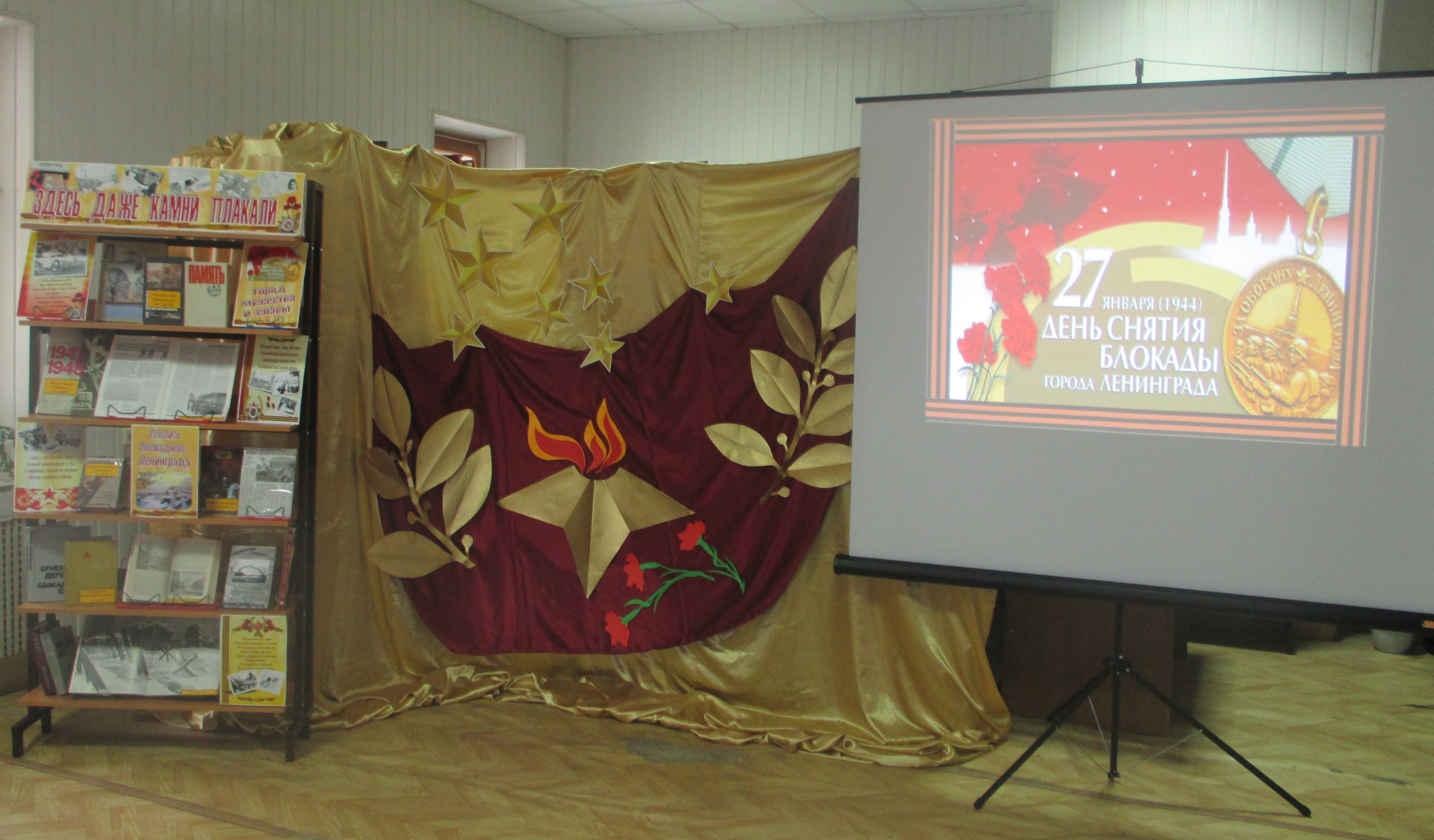 В преддверии этой даты в Центральной библиотеке открылась книжная выставка под названием «Здесь даже камни плакали», на полках которой представлена литература, собранная из фондов Центральной библиотеки. На мероприятие была приглашена жительница блокадного Ленинграда Зинаида Харитоновна Бибина (Кильганова), которая рассказала о тяжелой жизни в окруженном городе. Посетители смогут познакомиться с книгами, повествующими об этом событии, полистать художественные, документальные, научно-популярные издания. Напомним, блокада Ленинграда во время Великой Отечественной войны длилась с 8 сентября 1941 года по 27 января 1944 года. Вражескую блокаду Ленинграда советским войскам при поддержке морских и воздушных сил Балтийского флота удалось полностью снять после 3-х попыток её прорыва.