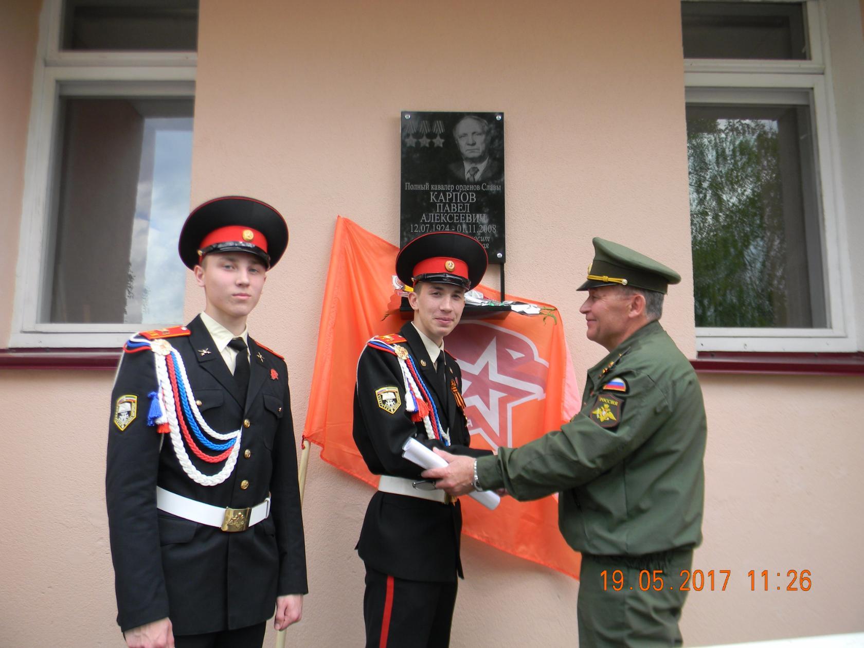 Одну из наград нашего героя – орден Красной Звезды -- преподнесла в дар школе его вдова Татьяна Андреевна Карпова, которая в качестве почётного гостя была приглашена на мероприятие. Она от всей души поблагодарила кадетов за дань памяти ветерану, за помощь, оказываемую ей школьниками. А для вдовы настоящим подарком стало открытие мемориальной доски Павла Карпова, к которой гости школы возложили живые цветы.