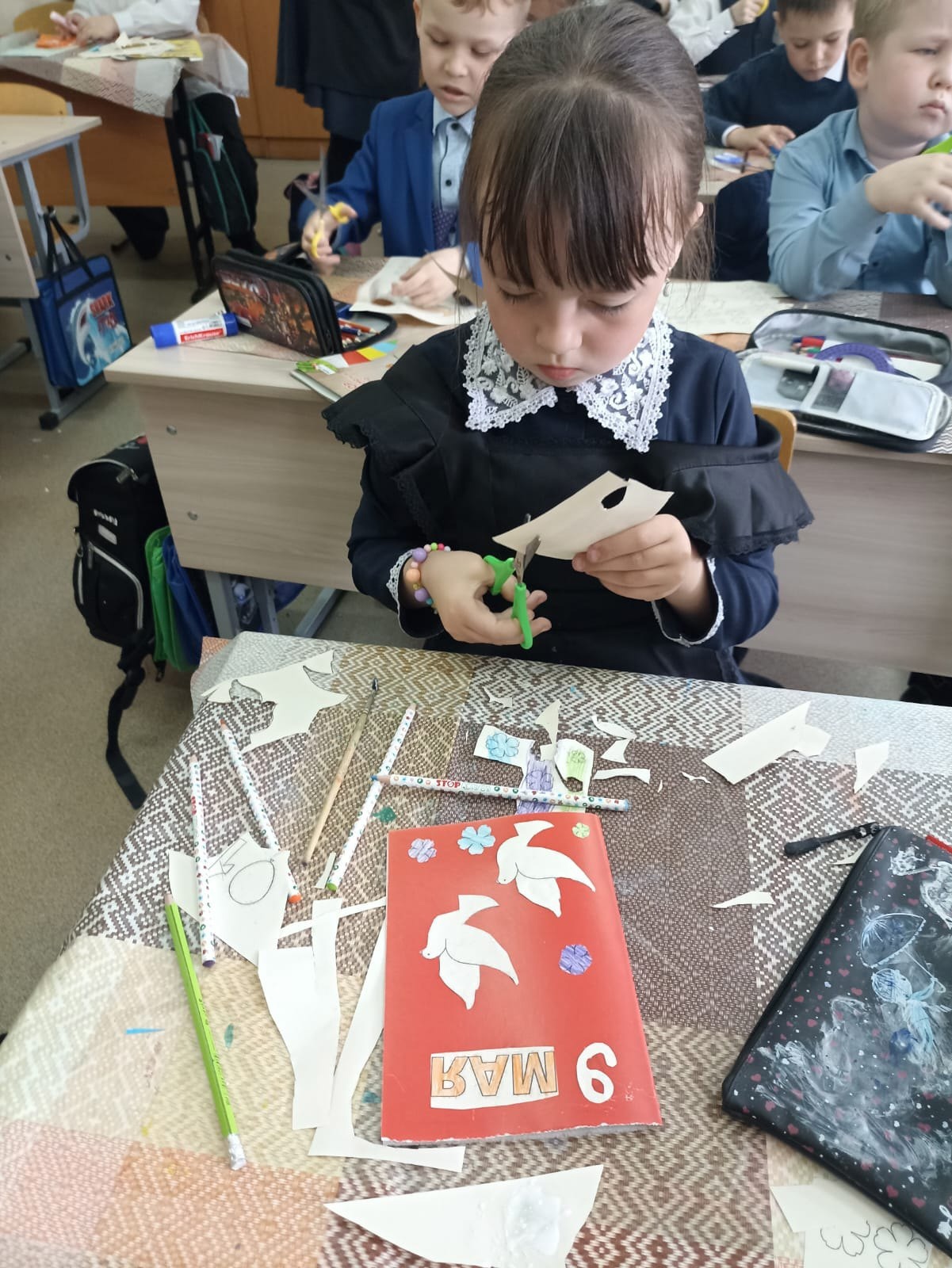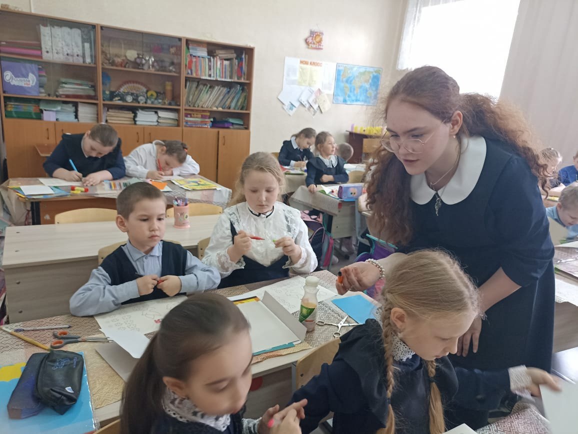 Его провели ученицы 5а класса Валиуллина Виктория, Гвоздь Арина и Минабутдинова Самира в 1а классе. Они рассказали о значении Дня Победы в мировой истории и нашей страны, о подвигах участников Великой Отечественной войны. Работа над открыткой стала своеобразной эстафетой памяти и связующим звеном поколения фронтовиков и наследников Победы.
