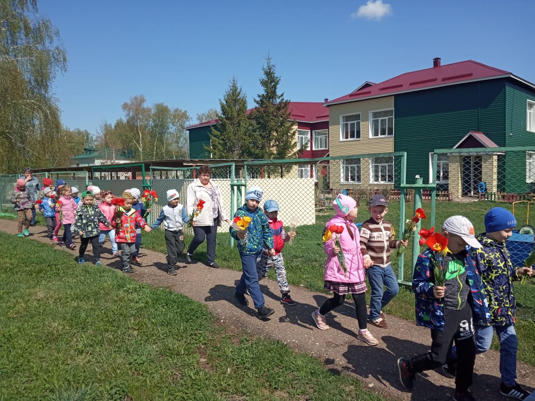 После мероприятия дети с педагогами посетили памятник павшим солдатам, возложили цветы к вечному огню. А также подарили открытки-памятки «Песни опалённые войной» прохожим и поздравили их с наступающим Великим праздником Победы!