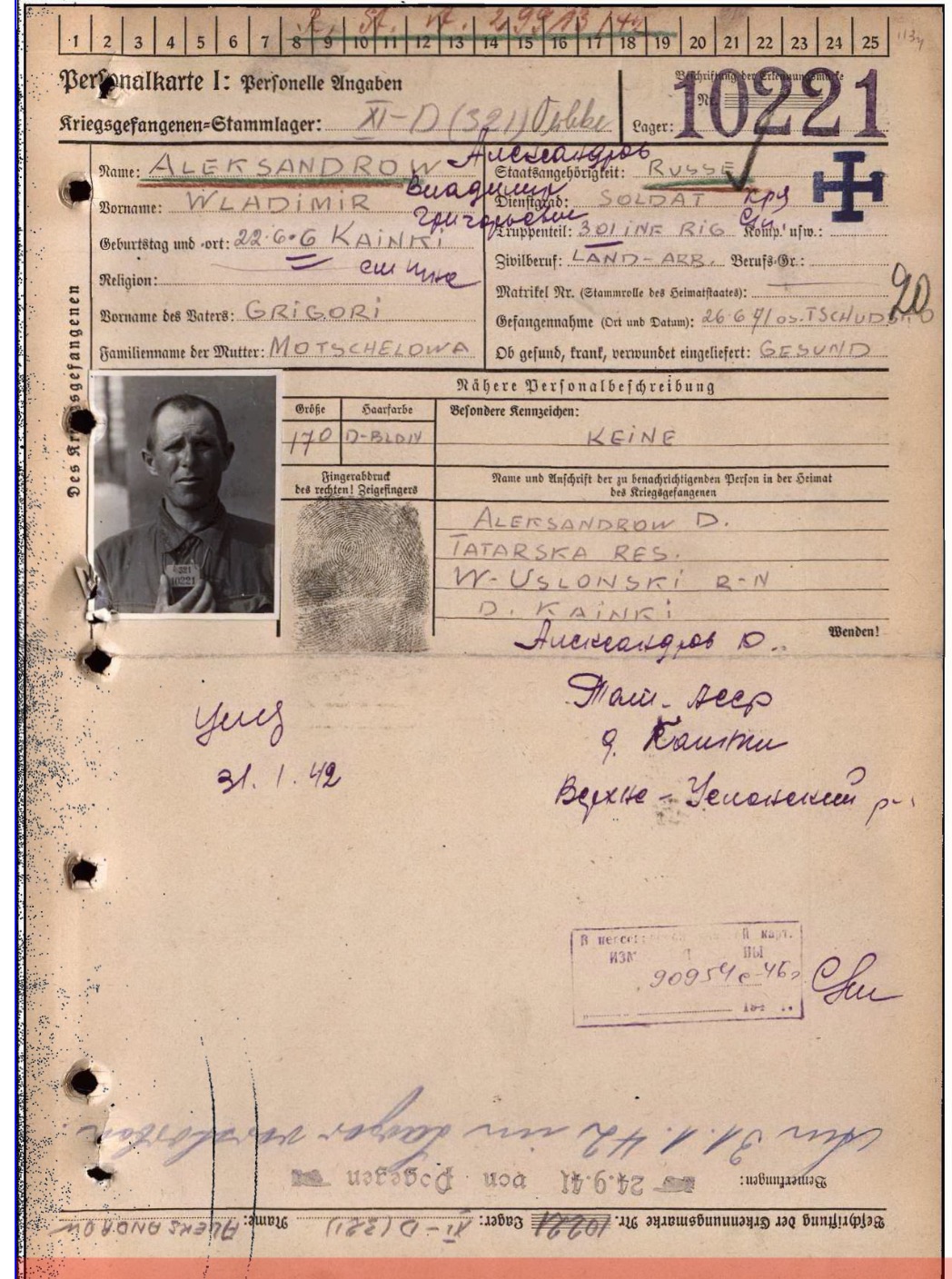 А поводом для письма в Татарстан стали результаты поиска информации о Владимире Григорьевиче Александрове, который родился 22 июня 1906 года в деревне Каинки Верхнеуслонского района и жил в Елабуге по адресу улица Гассара, дом № 1. 27 июня 1941 года он ушел на фронт, а в октябре его данные занесли в списки пропавших без вести. Но потом выяснилось, что рядовой Александров попал в плен во время боев на Чудском озере и 31 января 1942 года умер в фашистском лагере в немецком городе Эрбке в Нижней Саксонии.