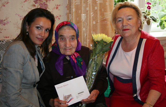 Первый заместитель руководителя райисполкома Лилиана Фаттахова и начальник орготдела Совета ЕМР Гузяль Тазиева преподнесли имениннице традиционные подарки – букет цветов, теплое одеяло и поздравительные открытки – от имени Президента России Владимира Путина и главы Елабужского района Геннадия Емельянова.