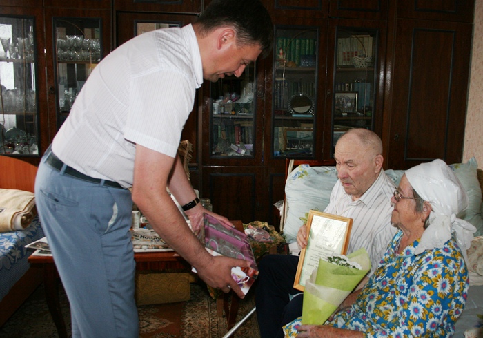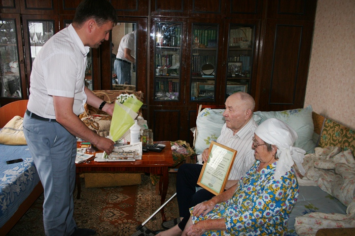 Делегация руководства города в лице руководителя Исполкома ЕМР Романа Исланова, начальника отдела ЗАГС Людмилы Григорьевой и председателя первичной ветеранской организации Совета ЕМР Ильдуса Низамова в День семьи, любви и верности поздравили с праздником семью Валеевых. Миннулла Валеевич и Мазгия Нургалеевна в этом году отметят Железный юбилей семейной жизни. Без малого 65 лет они муж и жена, вместе в успехах и неудачах.