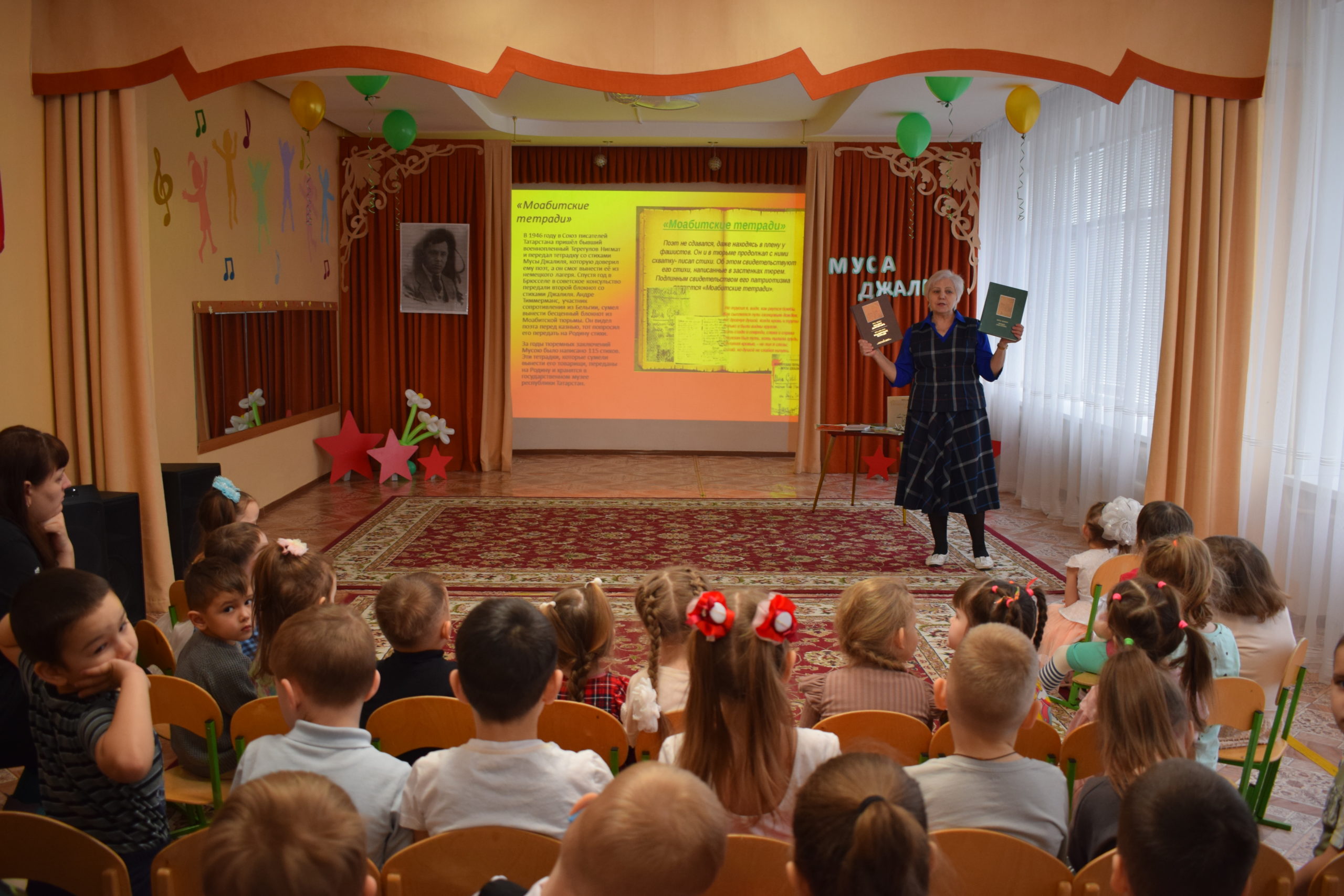 К 120-летию со дня рождения легендарного советского татарского поэта, журналиста и военного корреспондента Мусы Джалиля сотрудники центральной детской библиотеки организовали для воспитанников детского сада №4 «Ляйсан» особенное мероприятие «По следам мужества». Встреча началась с рассказа о детских годах Мусы. Малыши с интересом слушали истории о том, каким рос будущий поэт и как рождались его первые строки. Произведения Мусы Джалиля прозвучали на двух языках – татарском и русском.В завершение познавательного часа ребята смогли прикоснуться к творческому наследию героя. Была организована тематическая выставка, где юные участники познакомились с книгами автора.