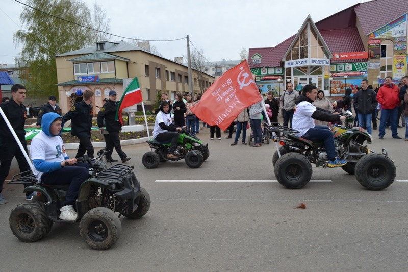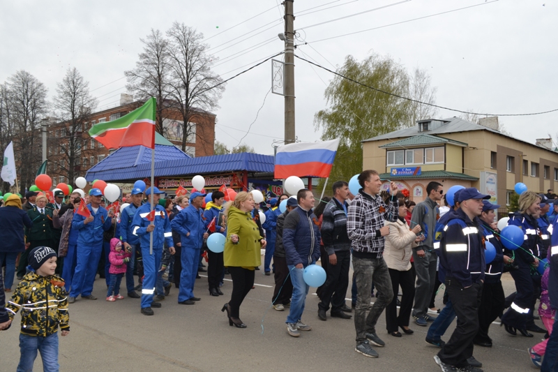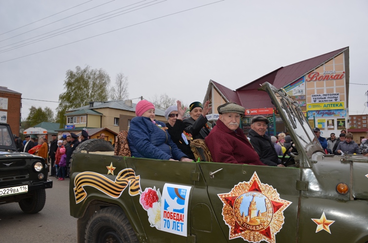 Отдавая дань памяти ветеранам, с песнями на парад вышли и воспитанники детских садов, и учащиеся, и трудовые коллективы. Проезжает по площади самоходный макет бронепоезда «Василий Чапаев», созданного агрызскими железнодорожниками для фронта. Напомнила те грозные годы и санитарная машина, подвозившая раненых с вокзала до агрызского госпиталя. Коллективы, вышедшие на парад, в знак благодарности и уважения к ветеранам выпустили в небо сотни шаров с пожеланиями мирного неба.