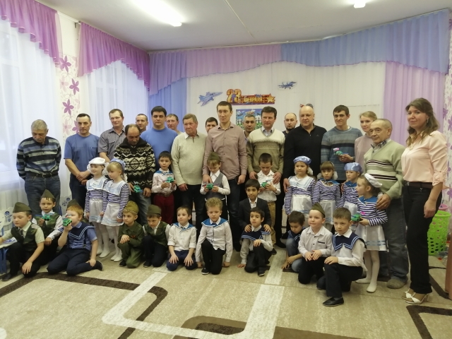 В МБДОУ «Детский сад «Малыш» города Тетюши» прошли праздники, посвященные Дню защитника Отечества. По традиции в этот день ребята поздравляют своих пап и дедушек с этим замечательным праздником. Вот и сегодня дети порадовали своих близких патриотическими песнями, стихами, красивым строевым маршем и подарками. А папы и дедушки, в свою очередь, в таких играх как «Переправа», «Всадники – стрелки», «Минёры» и др. Праздник удался на славу, все ребята и родители остались довольны. В преддверии наступающего праздника хочется пожелать нашим мальчишкам счастливого детства без воин, папам – силы и мужества, а дедушкам – крепкого здоровья!