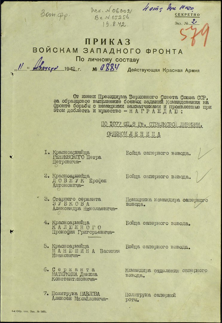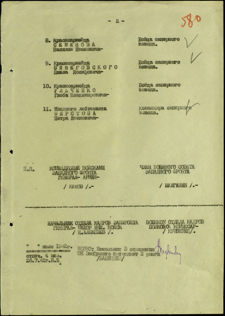 18 ноября 1941 года, 11 сапёров-панфиловцев во главе с младшим политруком Алексеем Павловым и командиром взвода Петром Фирстовым получили приказ, перекрыв дорогу, любой ценой обеспечить отход полка. Бойцы Фирстова стояли насмерть, уничтожали пехоту, поджигали танки врага. Бой длился 5 часов. За это время полк отошел на следующий рубеж обороны и изготовился к отражению атак противника. Первоначально считалось, что в бою погибли все 11. Военный совет Западного фронта представил героев-саперов к награде - орденами Ленина посмертно. Это единственный случай в Великую Отечественную войну, когда целый взвод саперов был награжден высокой правительственной наградой.