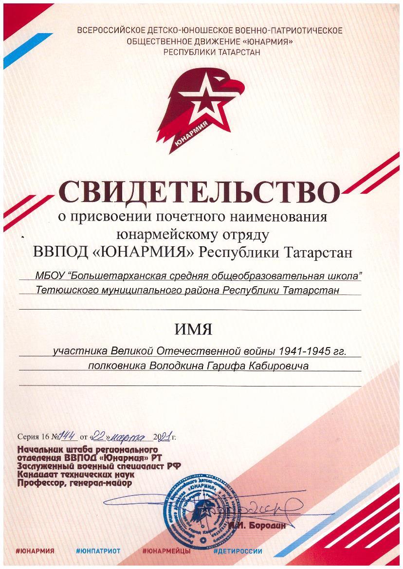 Юнармейскому отряду Большетарханской средней общеобразовательной школы присвоено имя участника Великой Отечественной войны 1941-1945 гг. полковника Володкина Гарифа Кабировича.