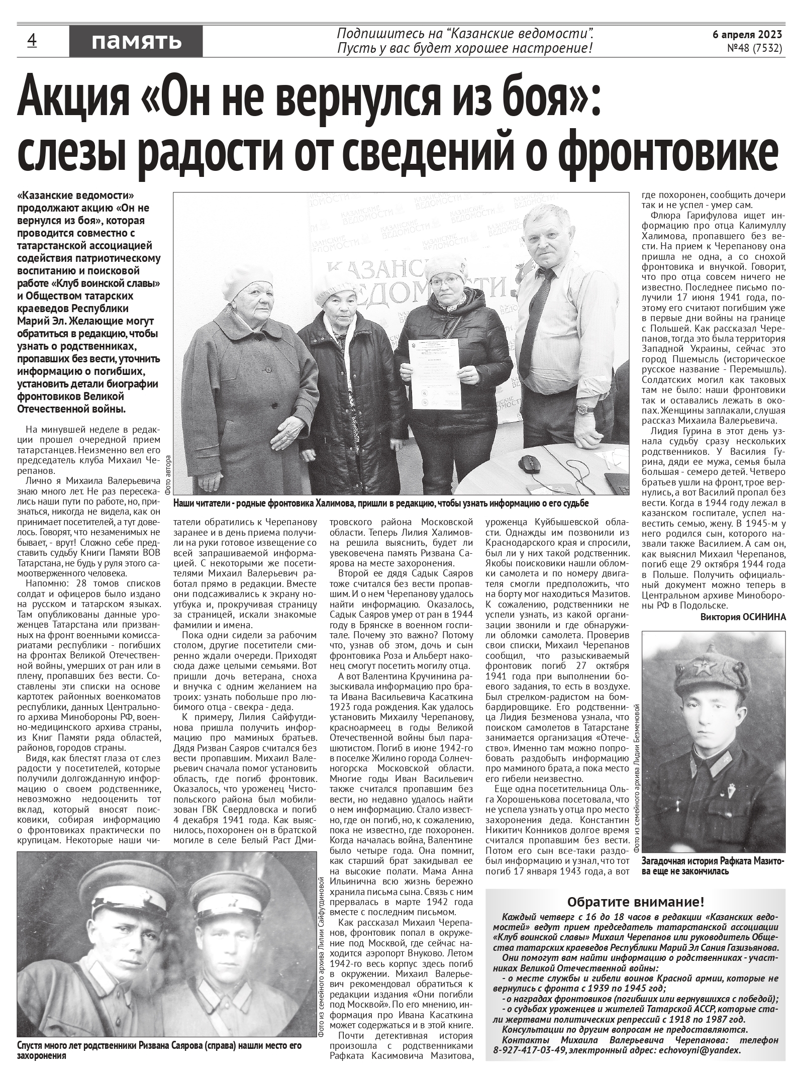 Газета «Казанские ведомости» продолжает акцию «Он не вернулся из боя», которая проводится совместно с татарстанской ассоциацией содействия патриотическому воспитанию и поисковой работе «Клуб воинской славы» и Обществом татарских краеведов Республики Марий Эл. Желающие могут обратиться в редакцию, чтобы узнать о родственниках, пропавших без вести, уточнить информацию о погибших, установить детали биографии фронтовиков Великой Отечественной войны.