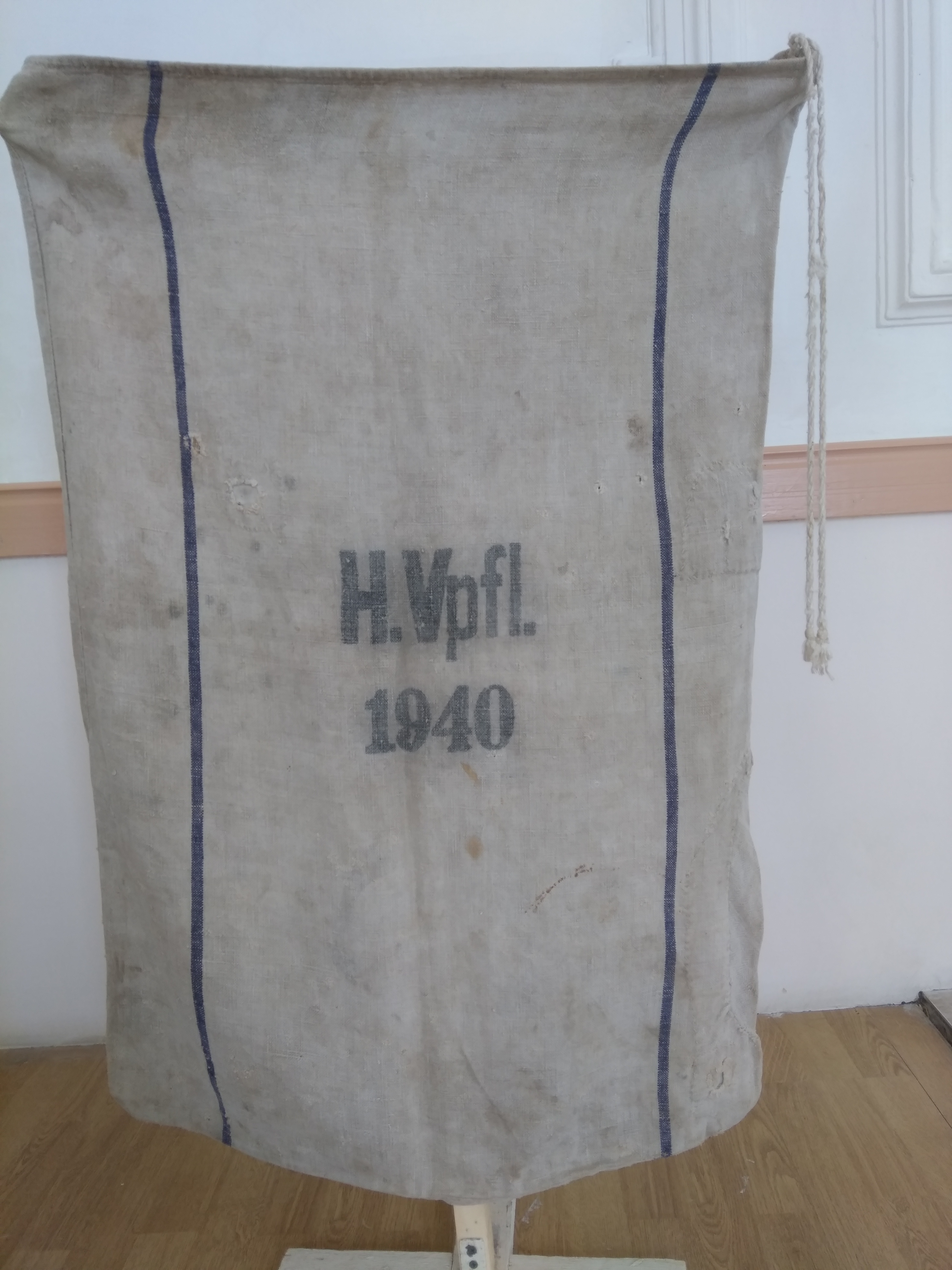 Несмотря на «преклонный возраст», на мешке хорошо читаются литеры и год выпуска: H. Vpfl. (что означает «Продовольственное снабжение армии») 1940. На оборотной стороне артефакта - чёрный орёл с распростёртыми крыльями, держащий в лапах стилизованный дубовый венок, со свастикой в центре – эмблема Третьего рейха. Мешок сшит из двух кусков холста. Точно такое же изображение орла и вышеназванных литер выбито и на оборотных сторонах обеих частей мешка, то есть если вывернуть его наизнанку, получится абсолютно такой же вид, что и с лицевой стороны.