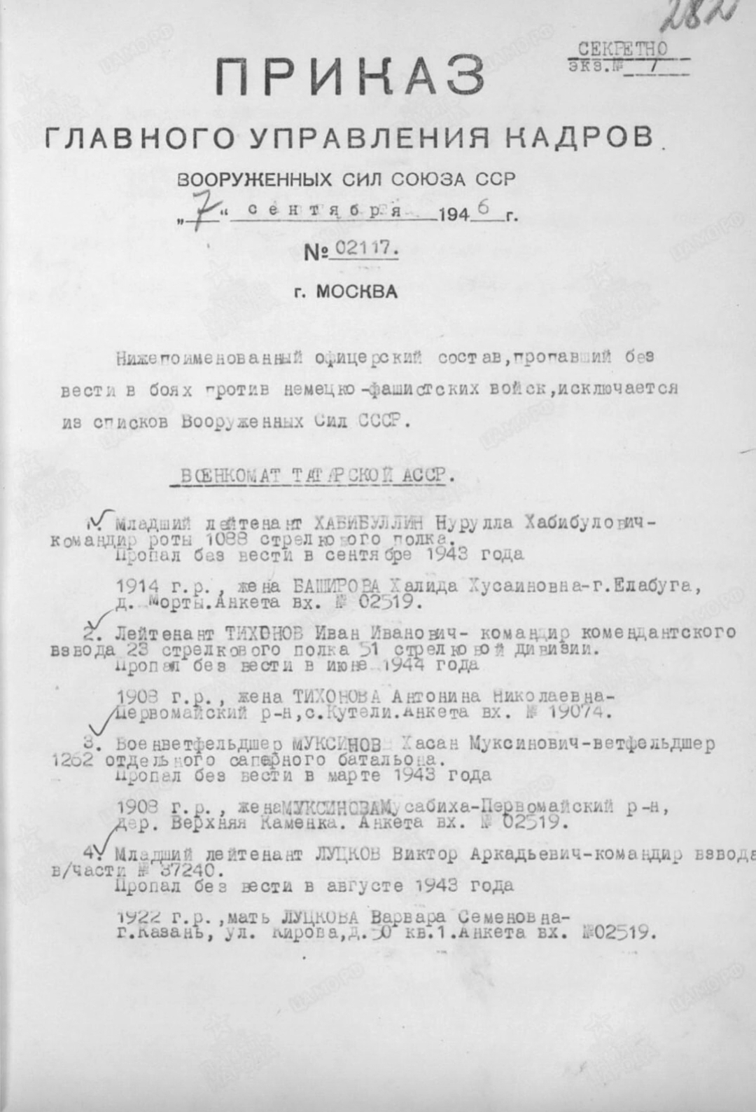Документ находится в Центральный Архив Министерства обороны. Шкаф:140 Ящик:24