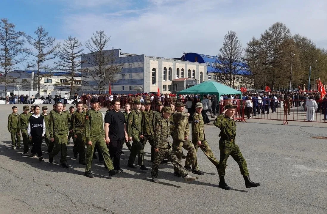 Юные участники с гордостью и ответственностью проходят торжественным маршем, демонстрируя строевую подготовку и сплочённость.