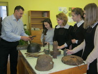 Дмитрий Владимирович поведал школьникам о великой миссии поисковиков по поиску и перезахоронению воинов, павших на фронтах Великой Отечественной войны, о том, как не просто определить места массовых солдатских захоронений и какая радость и гордость охватывает каждого, кому удается найти солдатский медальон или именную вещь. Каждая такая находка дает надежду на то, что еще одно имя может быть вырвано из забвения и воинские останки могут быть переданы родственникам погибшего и преданы земле на родине солдата. Учащиеся увидели экспонаты, найденные членами отряда «Выстрел» в ходе последней экспедиции в Городищенский район Волгоградской области, на места боев Сталинградской битвы: пробитые каски, котелки и кружки, уже «беззубые» мины и гранаты, смогли подержать их в руках, проникнуться духом истории.