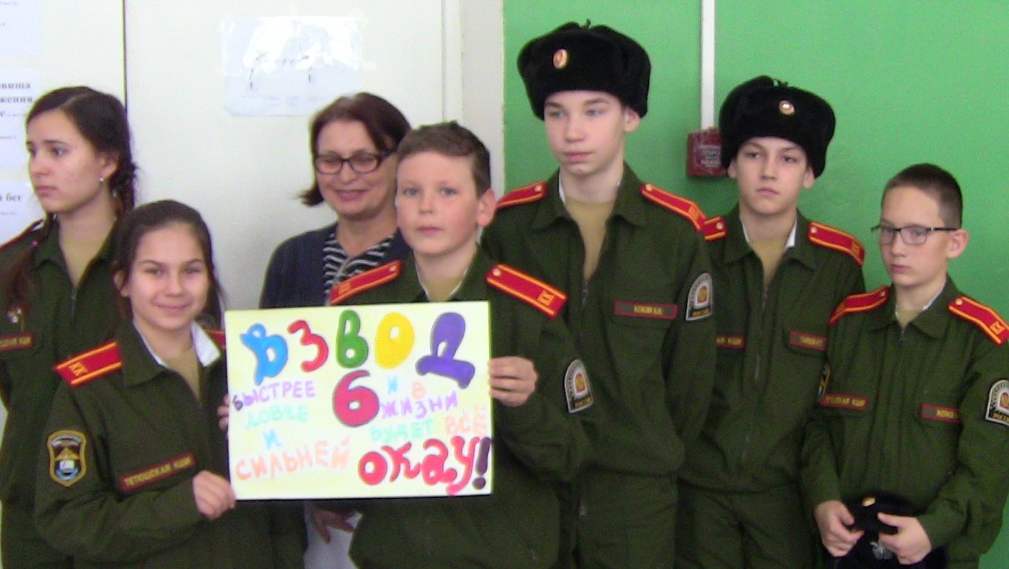 В общекомандном зачете по итогам участия в Школьной спартакиаде «Вперед, кадеты!», посвященной 30-летию вывода советских войск из Афганистана и Дню Защитника Отечества в младшей группе I место заняла команда 6 класса (командир команды Петров Г., воспитатель Загфаров Н. В.), II место - команда 5 класса (командир Ибрямов Н., воспитатель Костин