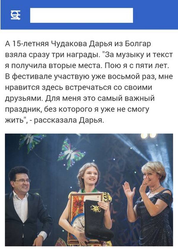 С 13-18.04.2015 года в г.Казани прошёл финал XV Открытого республиканского телевизионного молодежного фестиваля эстрадного искусства «СОЗВЕЗДИЕ - ЙОЛДЫЗЛЫК - 2015», посвященного 70-й годовщине Победы в Великой Отечественной Войне. От Спасского муниципального района участие приняли две финалистки в номинации вокал-соло старшая группа - Сафина Диляра Фанисовна и вокал – соло средняя группа Чудакова Дарья Андреевна. По итогам фестиваля Чудакова Дарья Андреевна была награждена по трем номинациям за музыку, за текст и была награждена за 2-е место. Она была награждена дипломом лаурета финала Республиканского фестиваля эстрадного искусства «Созвездие – Йолдызлык 2015» , посвященный 70-летию Победы в Великой Отечественной Войне и награждена ценными подарком. Сафина Диляра Фанисовна была награждена дипломом участника фестиваля.