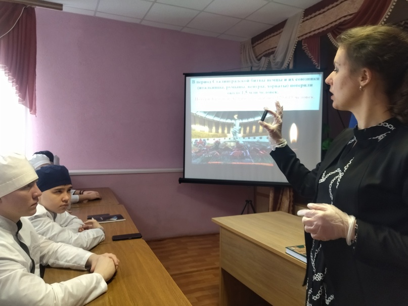Студентам Чистопольского медицинского училища рассказали об основных этапах и итогах, о подвигах наших земляков в битве на Волге, об отваге и героизме чистопольских речников: Александра Ивановича Яшманова, Антонины Яковлевны Кокориной, Ивана Васильевича Бычкова, Вениамина Петровича Иванова и других.