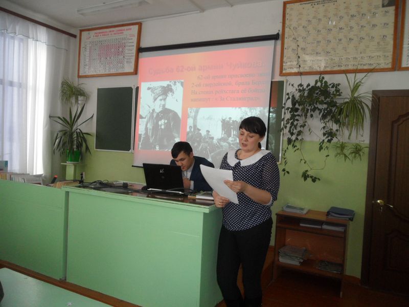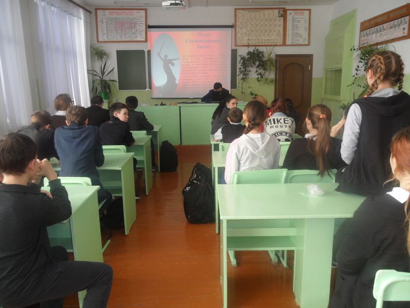 Она рассказала ребятам о Сталинградской битве, о итогах, значений и влияний событий Сталинградской битвы на исход Великой Отечественной войны. Мероприятие сопровождалось показом презентации.