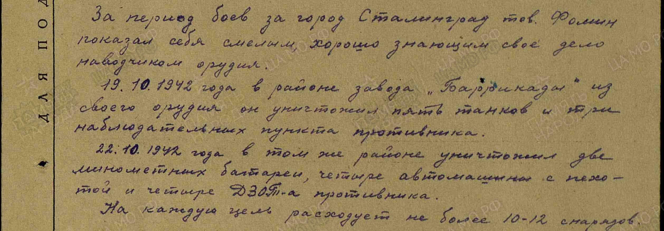 В наградном листе сказано: За период боев за Сталинград тов. Фомин показал себя смелым, хорошо знающим свое дело наводчиком орудия.