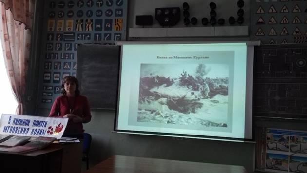 Мероприятие началось с краткого исторического экскурса, где шла речь о важных периодах Сталинградской битвы, о её историческом значении, о памяти тех грозных лет, о великих подвигах защитников Сталинграда, о Дне сталинградской катастрофы – 23 августа 1942 г., когда почти полностью был разрушен и сожжен город на Волге. Ребята услышали о героизме и мужестве, проявленном при защите Сталинграда; была показана слайдовая презентация - "Хроника Сталинградской битвы". В заключение студентам был показан кратко метражный фильм «Битва под Сталинградом». Мы не имеем права забыть тех, кто погиб ради того, чтобы мы сейчас жили. Мы обязаны всё помнить и гордиться теми, кто защищал Сталинград.