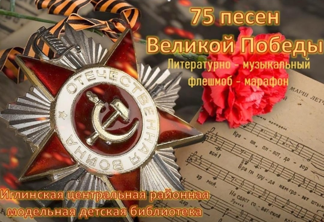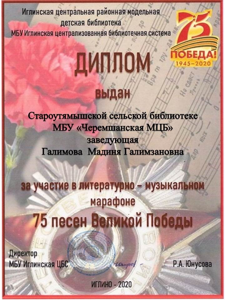 Староутямышская библиотека Черемшанского района присоединилась к литературно- музыкальному флешмоб - марафону "75 песен Великой Победы", посвященному 75- летию Победы в Великой Отечественной войне 1941- 1945 года. Организатор - Иглинская центральная районная модельная библиотека.