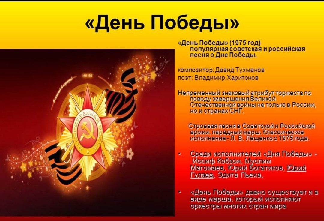 Самым популярным музыкальным символом, с которым ассоциируется Великая Отечественная война последние 35 лет, является песня "День Победы", написанная на стихи участника той войны Владимира Харитонова на музыку представителем послевоенного поколения Давида Тухманова к 30-летию Великой Победы в 1975 году. Композиция является непременным знаковым атрибутом торжеств, посвящённых победе в Великой Отечественной войне как в России, так и в ряде бывших советских республик.