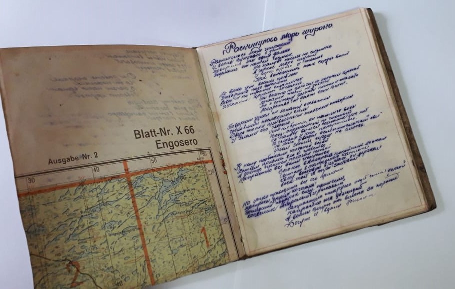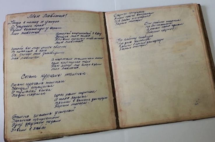 В перерывах между боями солдаты переписывали друг у друга любимые песни, несмотря на тяжелое время, пели их, мечтая о мирной жизни. Из старых карт, аккуратно сшитыми нитками листы, отец мастерил этот блокнот своими руками. Красота почерка отца всегда поражала нас, и мы любуемся ей до сих пор, а песни, которые пели в военное время будут жить всегда, напоминая о тяжелых временах, которые пережил наш народ.