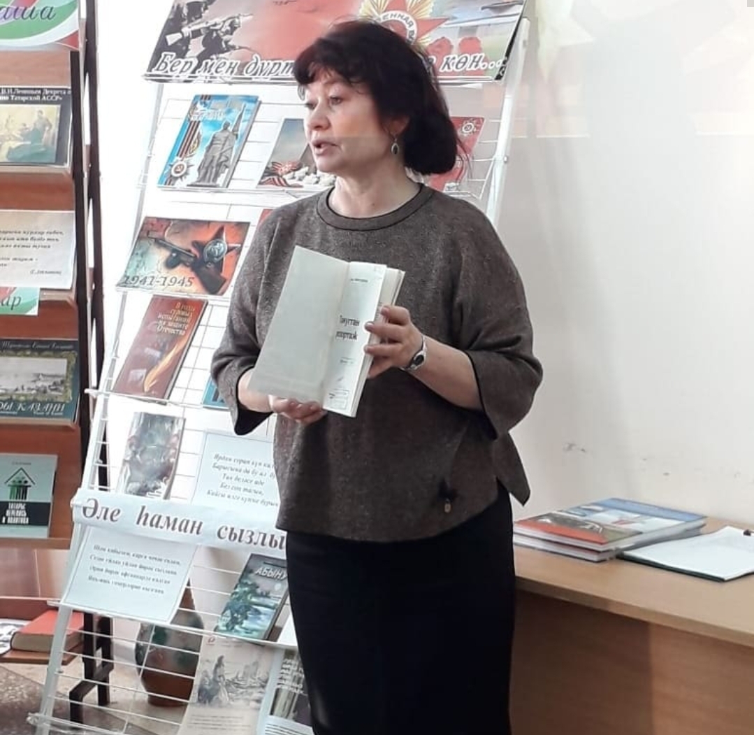 А так же была представлена книжная выставка и обзор по теме "Әле һаман сызлый яралар". Был показан буктрейлер по книге Ф.Сафина "Биек тауның башларында".