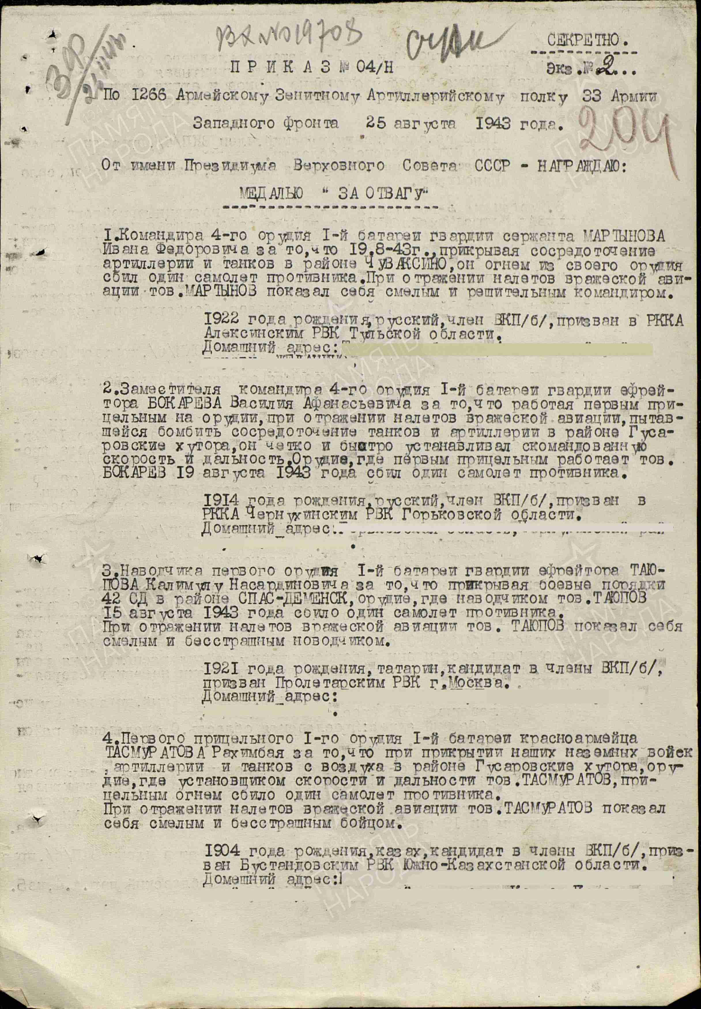 25 августа 1943 года, будучи в составе 1266-го Армейского Зенитного Артиллерийского полка 33-й Армии Западного фронта, мой дед, прикрывая боевые порядки 42-й стрелковой дивизии в районе Спас-Деменск, сбил самолёт противника. За мужество и отвагу, проявленные при отражении налетов вражеской авиации, он был дважды награжден медалью «За отвагу».