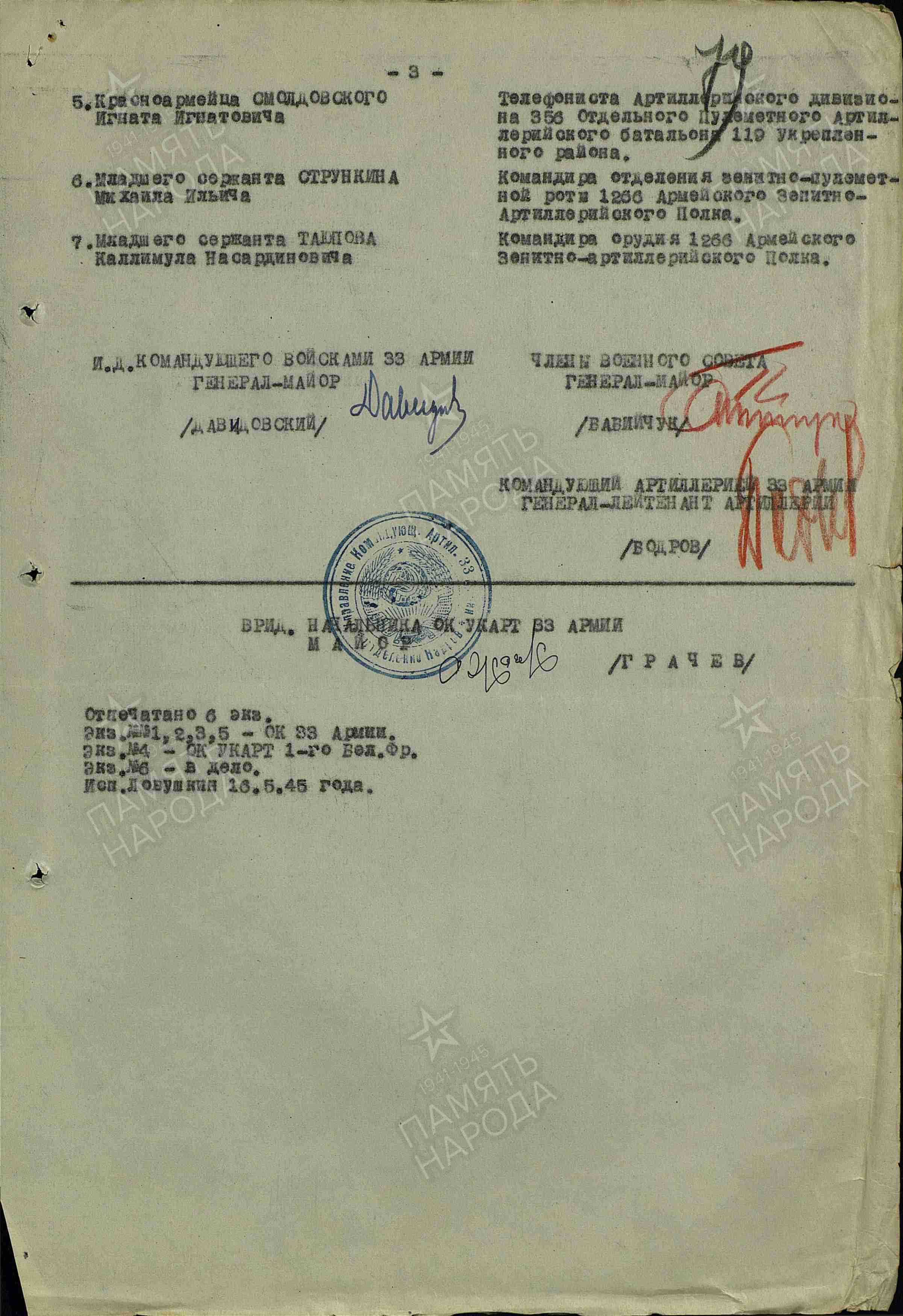 С 30 марта по 16 апреля 1945 года расчет моего деда, находясь в составе батареи, обеспечивал надежную противовоздушную оборону жизненно важной переправы через реку Одра в районе города Фрэнкфурт-на-Одере, внося вклад в победное завершение войны.