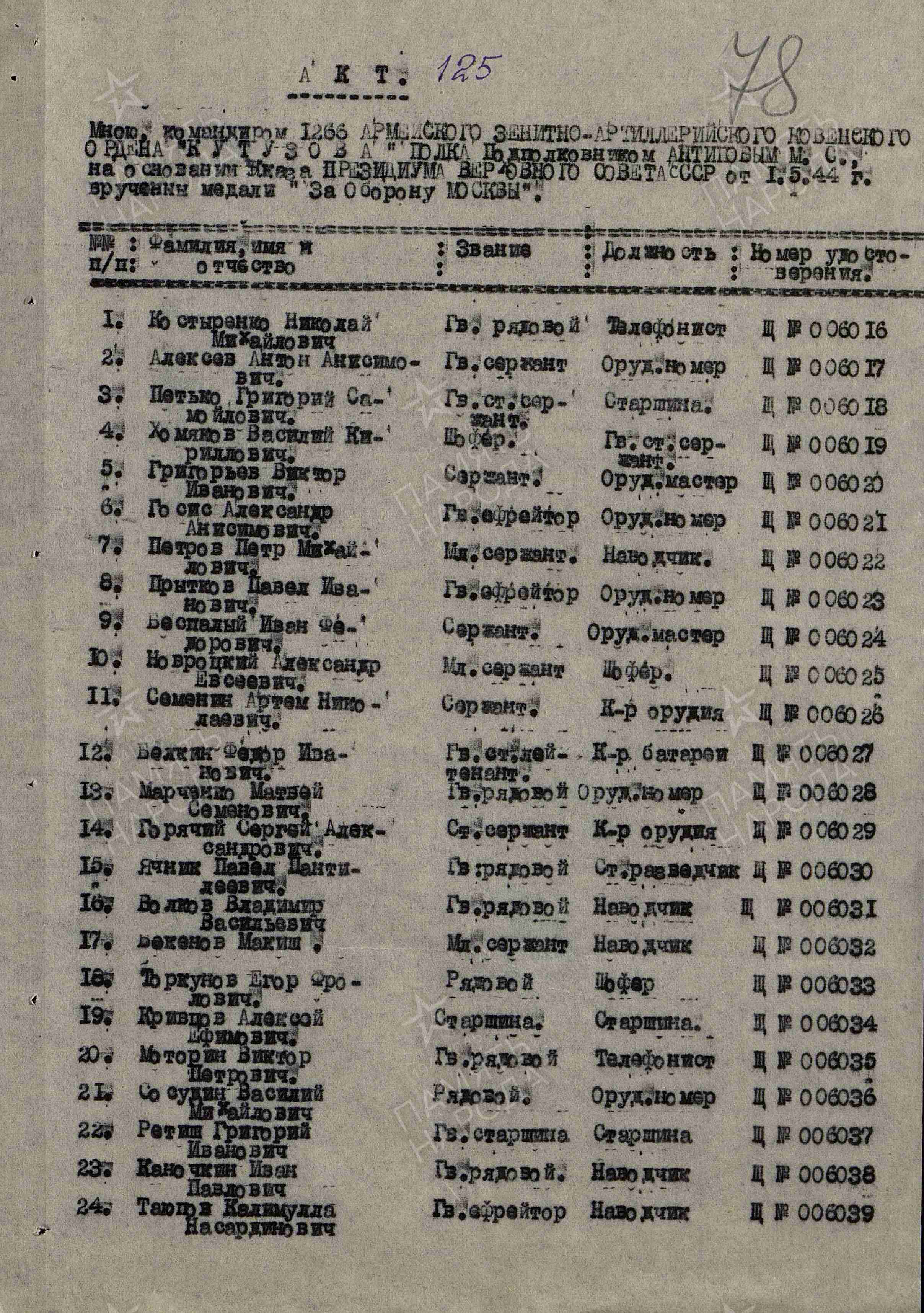 1 мая 1944 года, в составе прославленного 1266-го Армейского Зенитного Артиллерийского полка, награжденного орденом Кутузова, мой прадед встал на защиту столицы и внес свой вклад в разгром фашистских войск под Москвой, за что был отмечен медалью «За оборону Москвы».