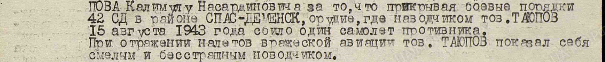 13 марта 1945 года расчёт, которым командовал мой дед, Таюпов Калимулла, проявил исключительное мастерство и отвагу, сбив вражеский самолёт ФВ- 190 Этот вражеский бомбардировщик представлял серьезную угрозу для боевых порядков артиллерии и пытался прорваться к переправе. За годы войны на боевом счету расчёта, которым командовал мой дед, числилось три сбитых самолёта противника, что стало свидетельством его высокого профессионализма и мужества. За свои подвиги Таюпов Калимулла был дважды удостоен ордена Славы 3 степени.