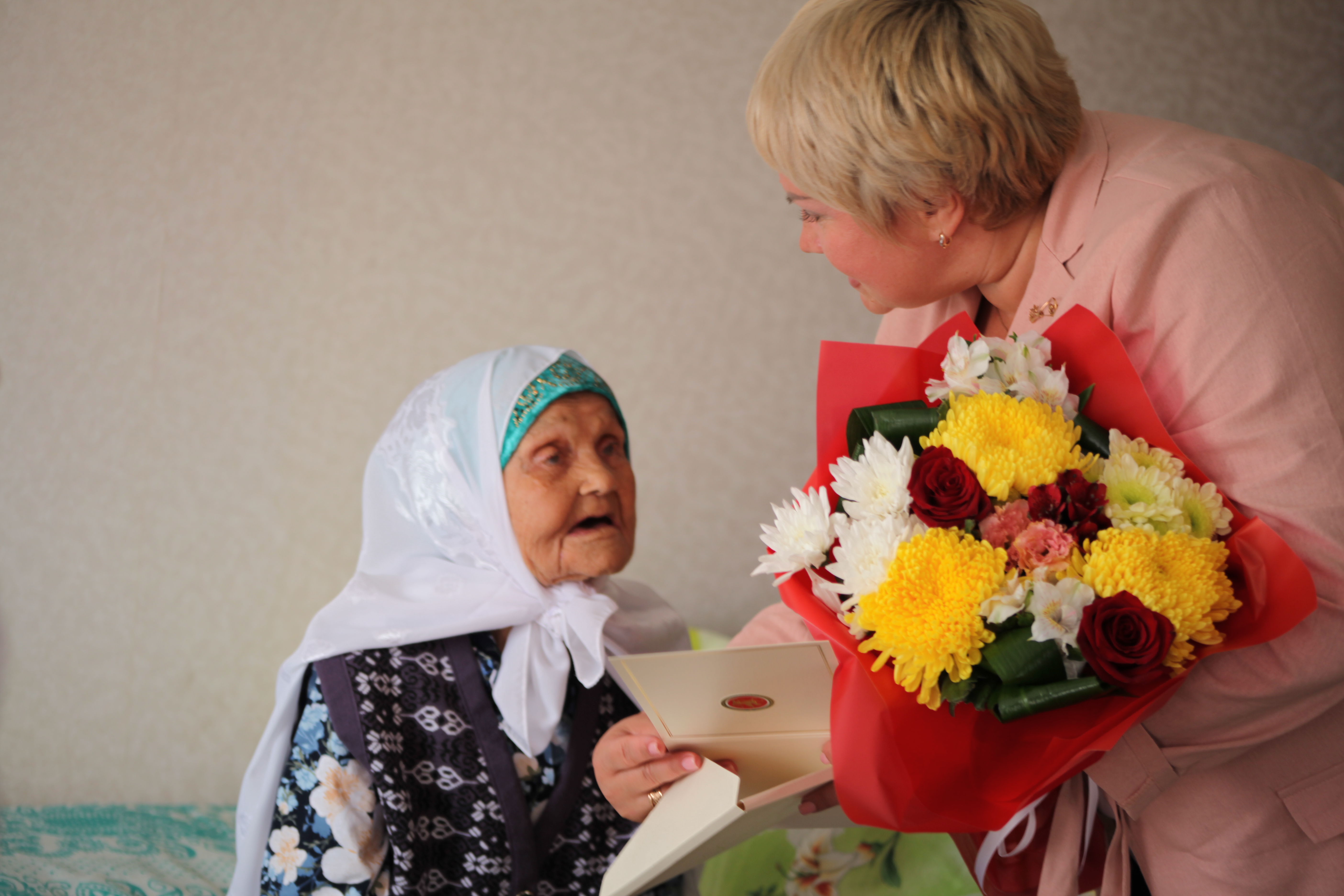 С вековым юбилеем Беку Латипову поздравили, вручили подарки и письмо от Президента РТ заместитель руководителя Исполнительного комитета района по социальным вопросам Ольга Плеханова и глава Кудашевского сельского поселения Гузалия Хайсарова.
