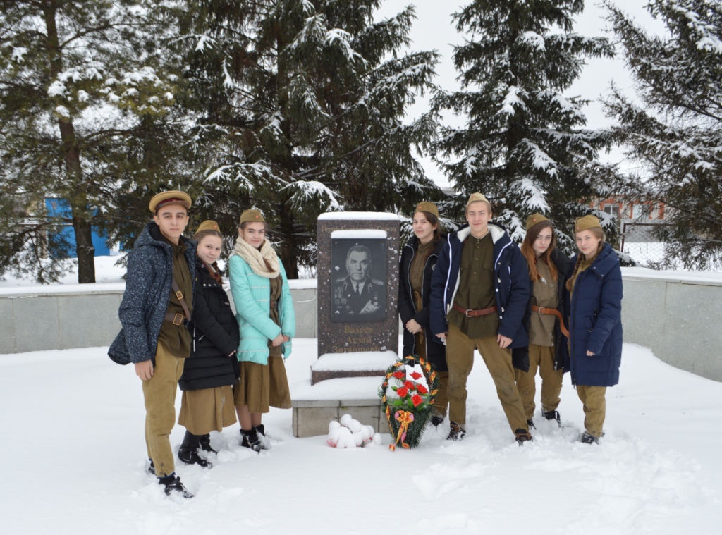 После выступления в гимназии, ребята возложили корзину с цветами к памятной стеле Герою Советского Союза, уроженцу с.Каргали А.З.Валееву.