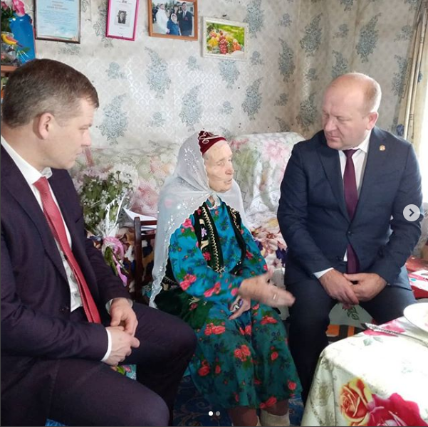 В преддверии 75-летия Великой Победы, в рамках проекта "У войны не женское лицо" поздравить ветерана пришли глава района Марат Гафаров, заместитель главы Стародрожжановского сельского поселения Рамиль Низамов.
