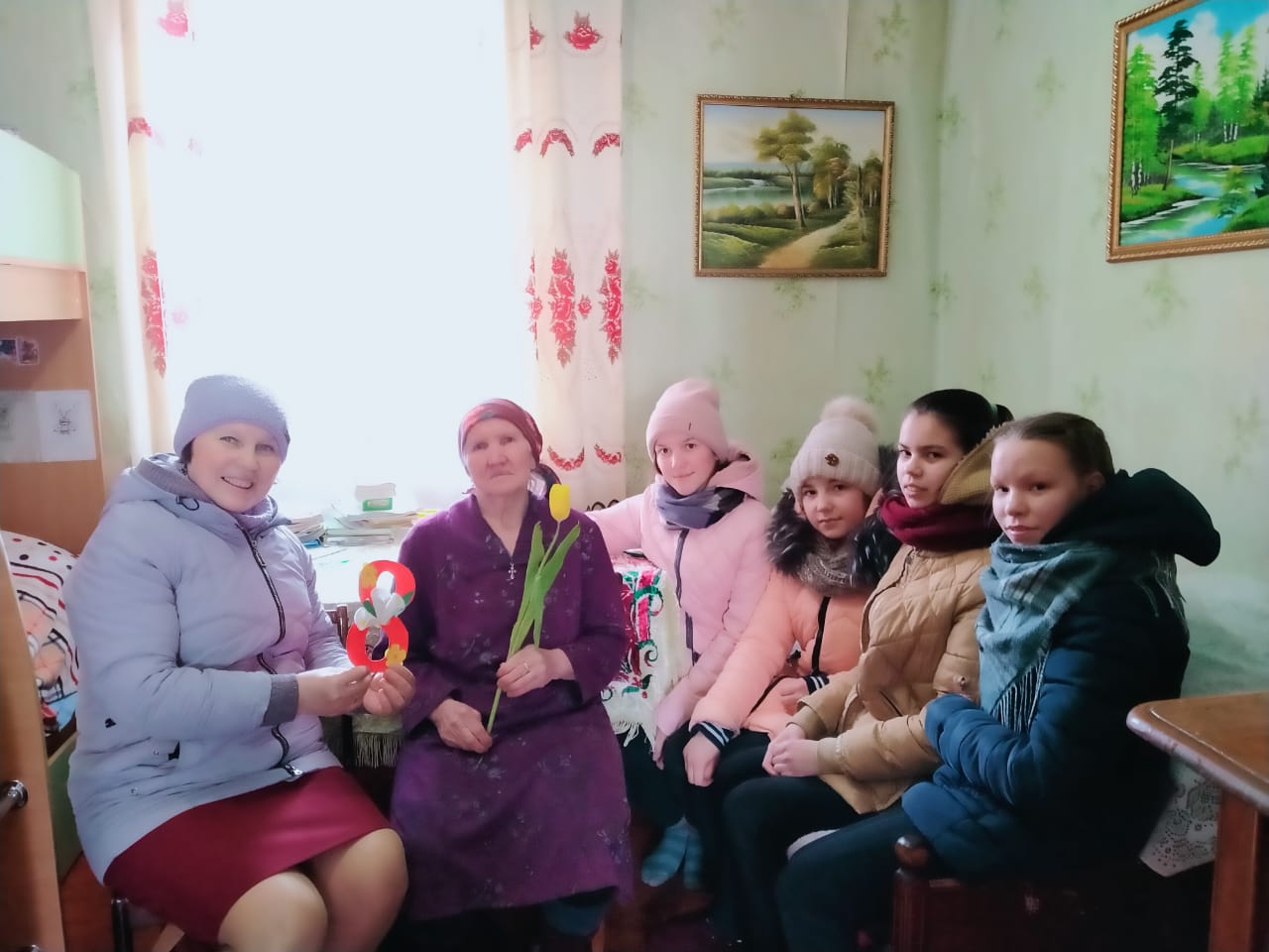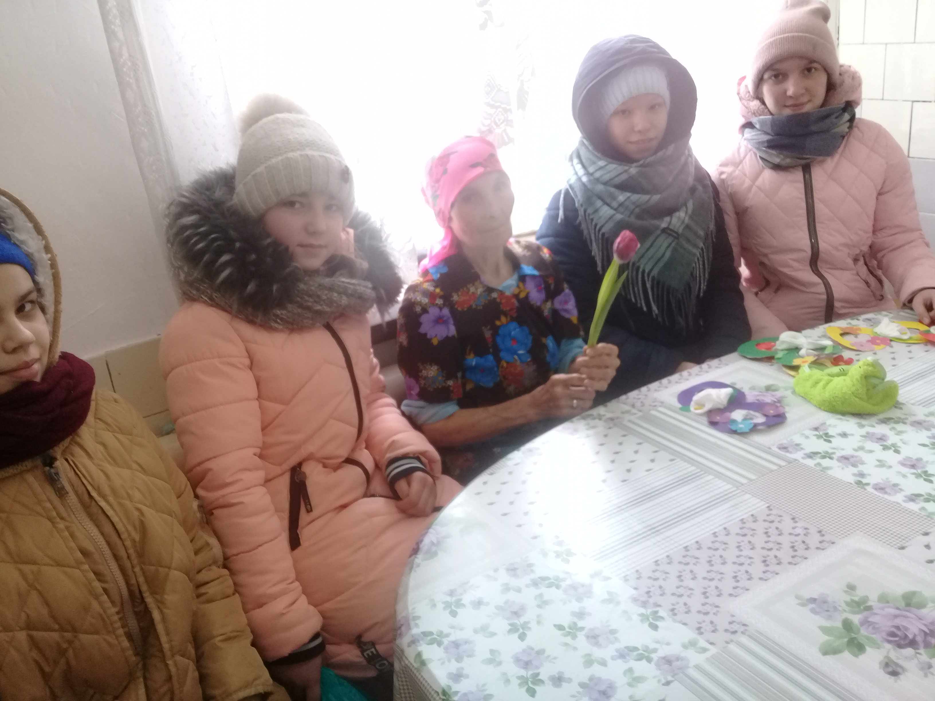 Накануне праздника Международного женского дня , учащиеся нашей школы ходили к престарелым бабушкам категории "Дети- войны", чтобы порадовать их своим вниманием и открытками. На кружке "Волшебный карандаш" дети смастерили открытки, затем подарили их бабушкам, а также живые тюльпаны. Бабушки были очень рады нас видеть!