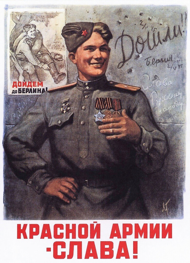 В следующий раз этот же боец появился на плакате в победном 1945 году на не менее знаменитом плакате «Красной армии - слава!». За его спиной на стене поверженного Рейхстага висит первый плакат с его изображением «Дойдем до Берлина!», а также надписи «Дошли!» и «Слава Русскому народу».