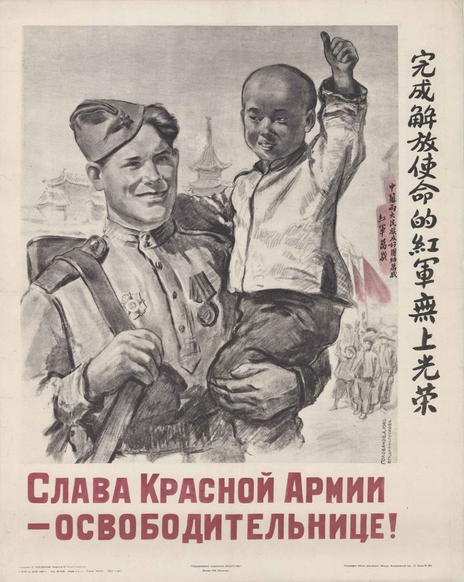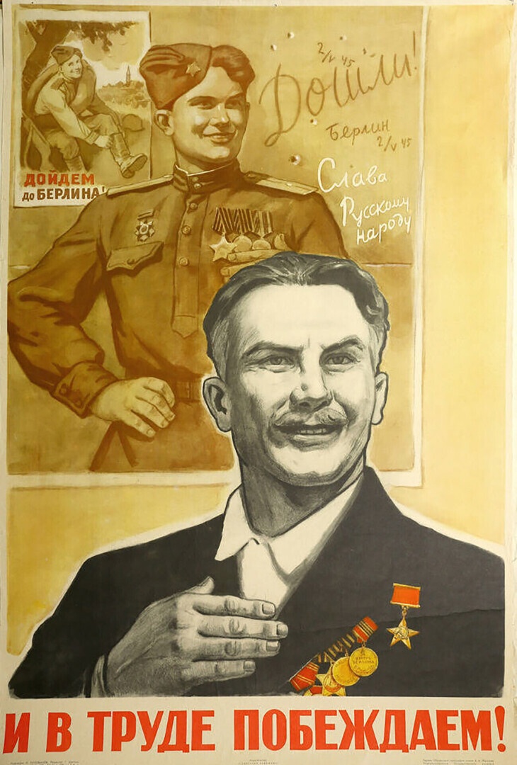В 1962 году уже пожилой ветеран с предыдущих двух плакатов (как и сами их изображения) Леонид Голованов изобразил на своей новой работе «И в труде побеждаем», где на груди того самого бойца светится звезда Героя Социалистического Труда. Был наш герой изображен и на менее знаменитом плакате – «Слава Красной Армии - освободительнице!», который Голованов создал в 1945 году. На руках нашего героя машет ручкой веселы китайский мальчик.