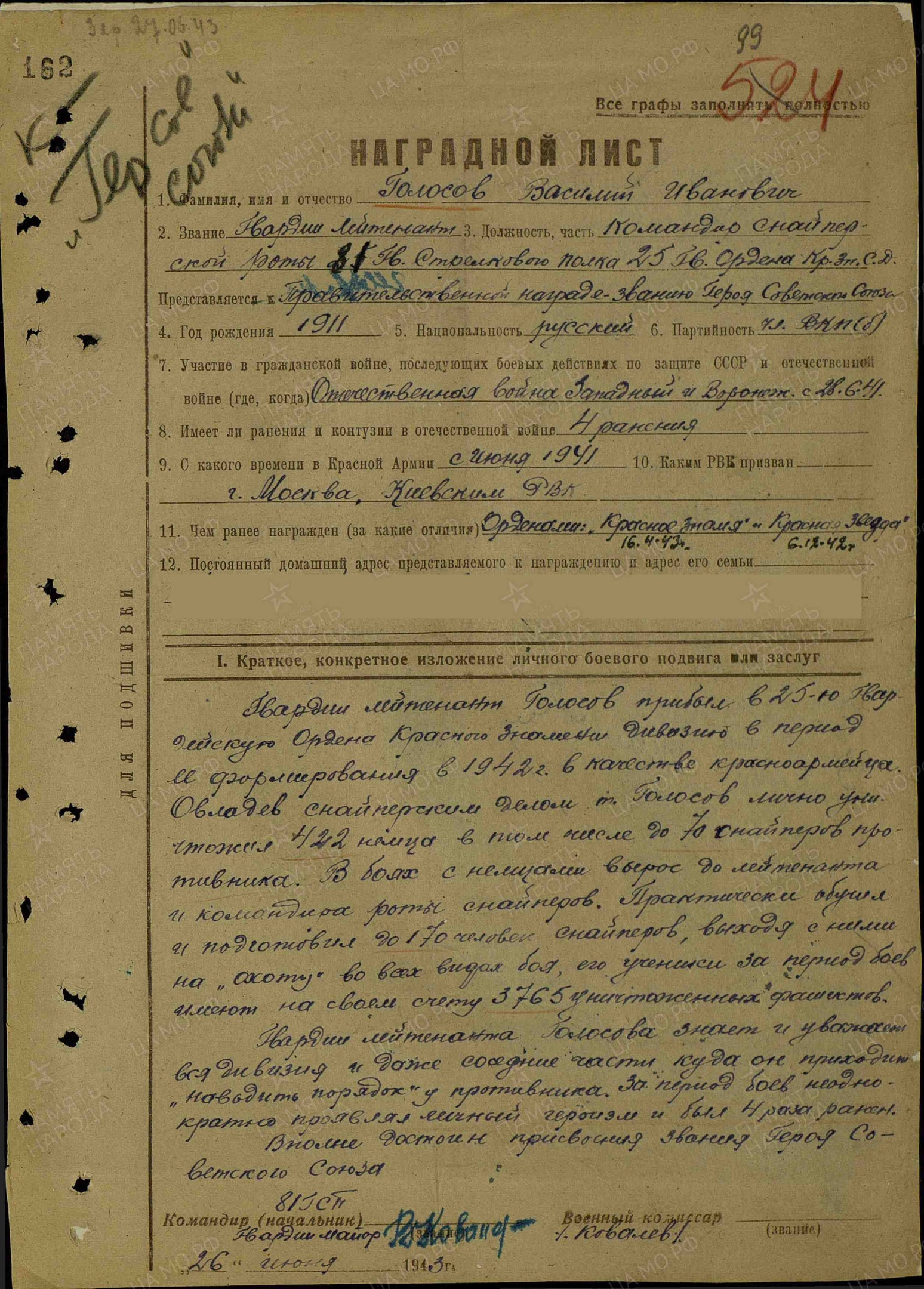 Ниже представлены все упомянутые плакаты, наградной лист и фотография на которой Василий Голосов проводит занятие по подготовке снайпера.