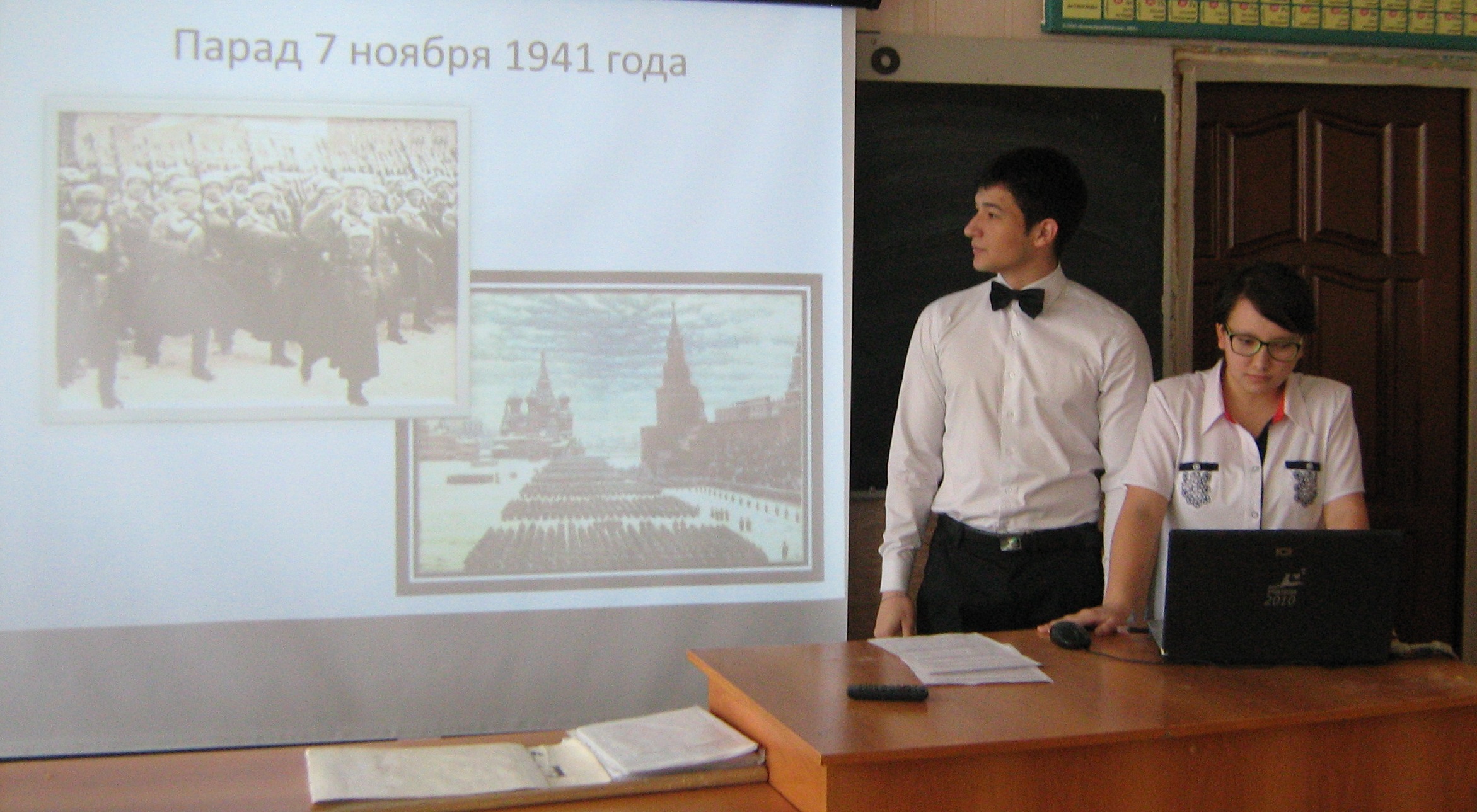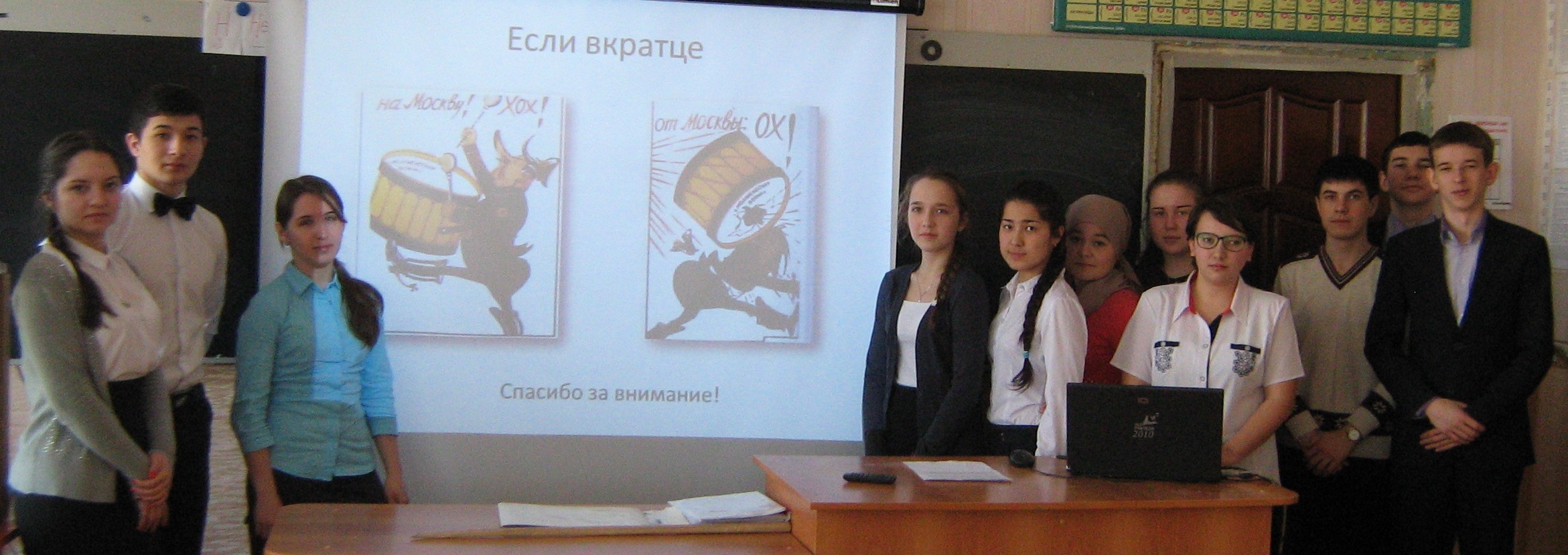 18 апреля в 11в классе состоялся классный час, посвященный 70-летию Победы. Тема классного часа «Битва за Москву». Школьники рассказали об одной из кровавых сражений Великой Отечественной войны - битву за Москву. Битва за Москву стала переломным моментом в этой войне. Миф о том, что Гитлер непобедим, был разрушен. Началось медленное, но необратимое наступление советских войск по всем фронтам. Командовал наступлением под Москвой великий полководец Г.К.Жуков.В этой битве и гитлеровские войска и советские войска понесли огромные потери в живой силе и в технике. Герои этой битвы - панфиловцы, которые отразили три атаки танковой дивизии фашистов, но не отступили. Все они герои посмертно. Крылатую фразу Клочкова: «Велика Россия, а отступать некуда: позади - Москва!» и сейчас все помнят...