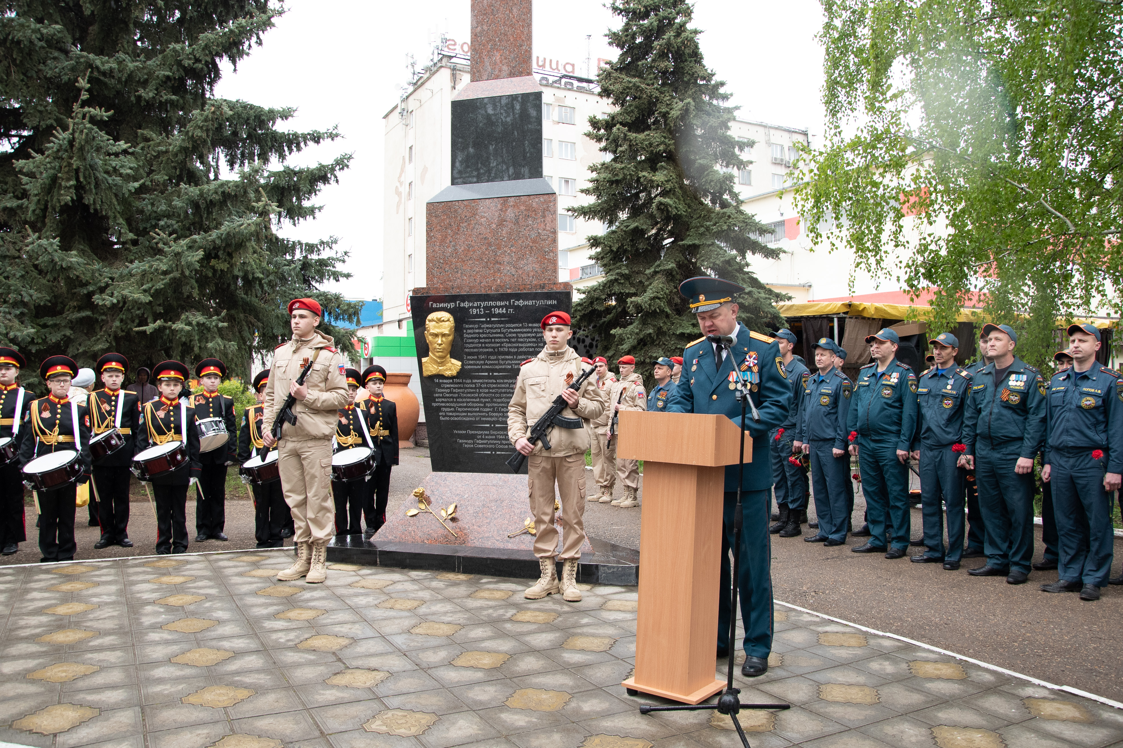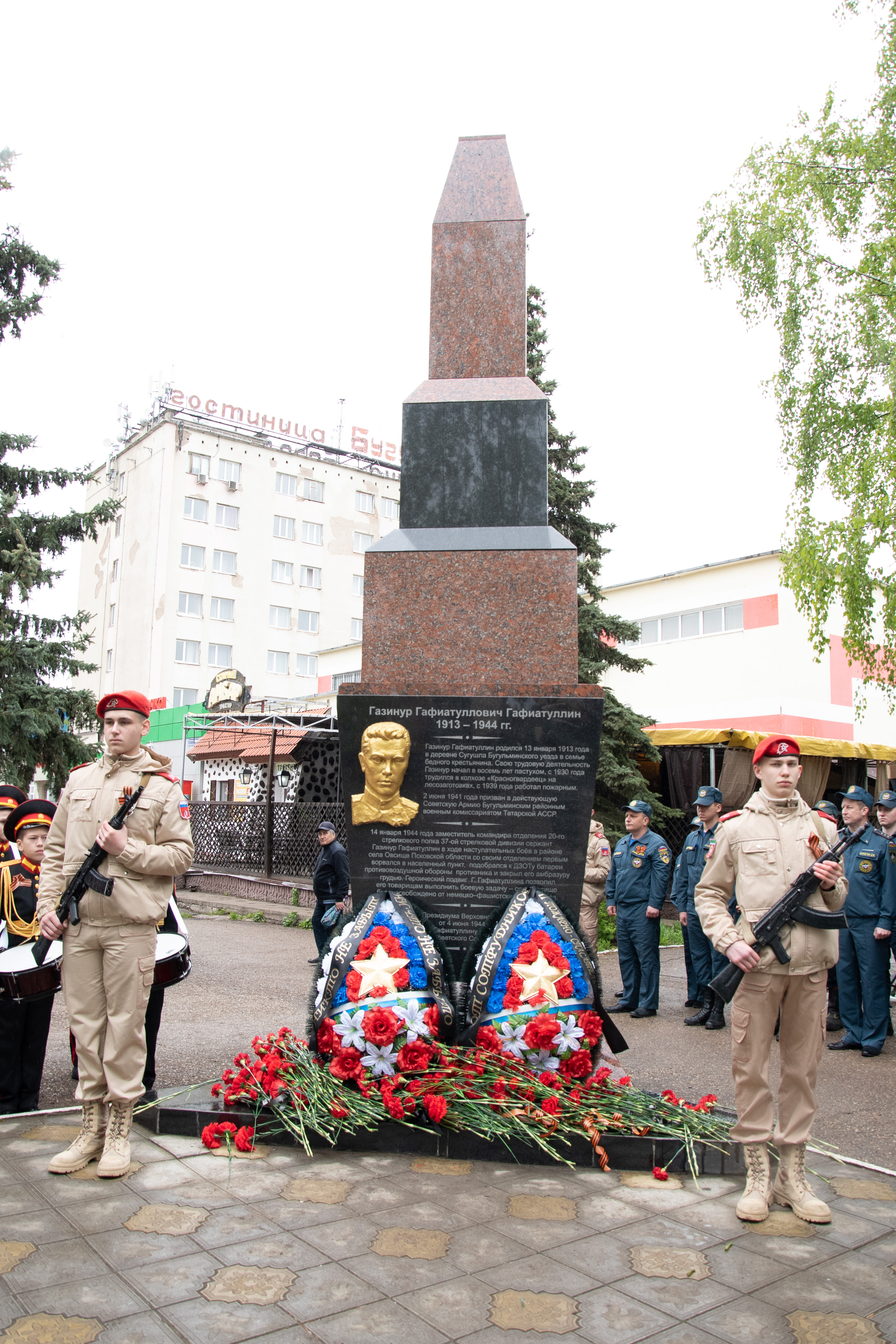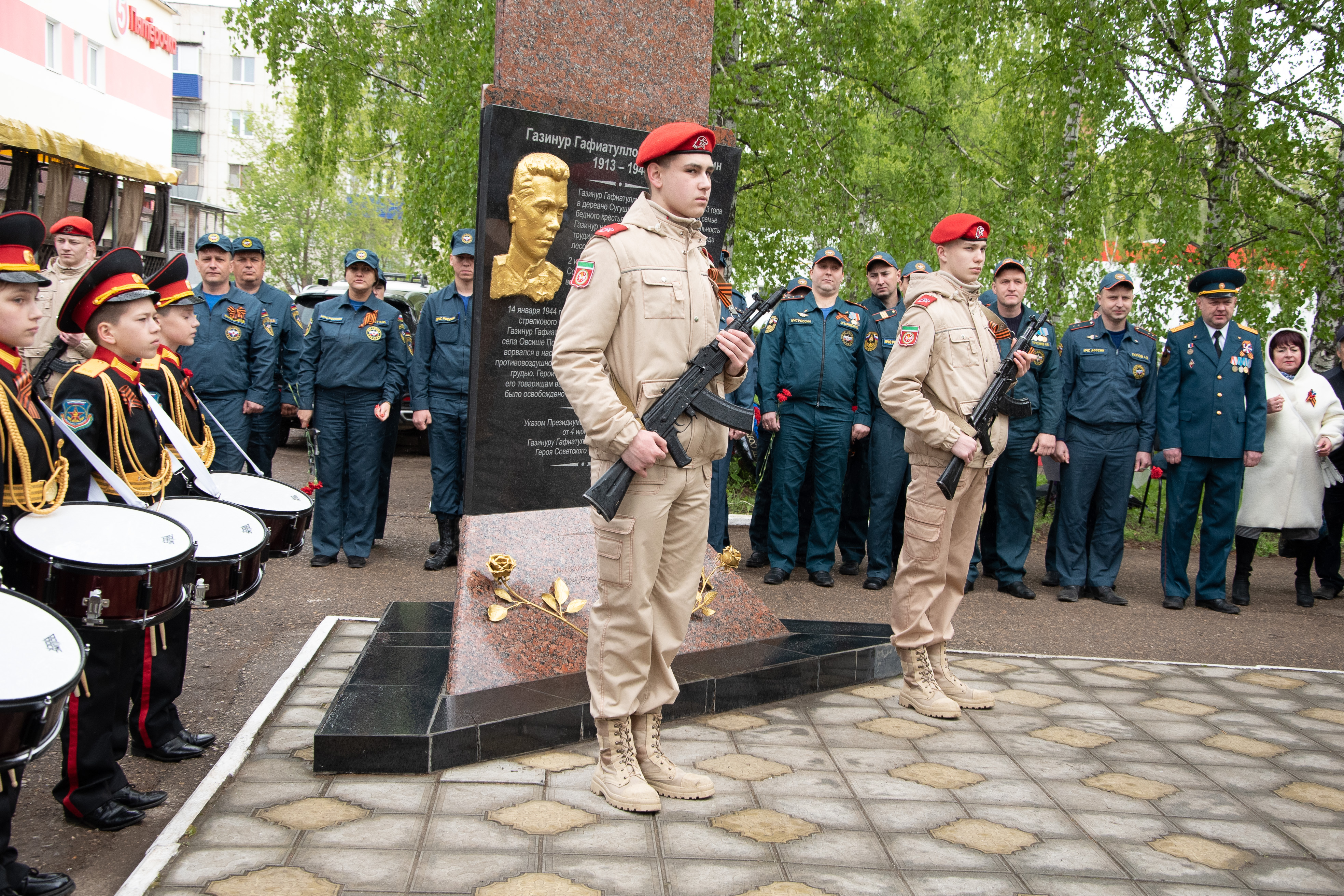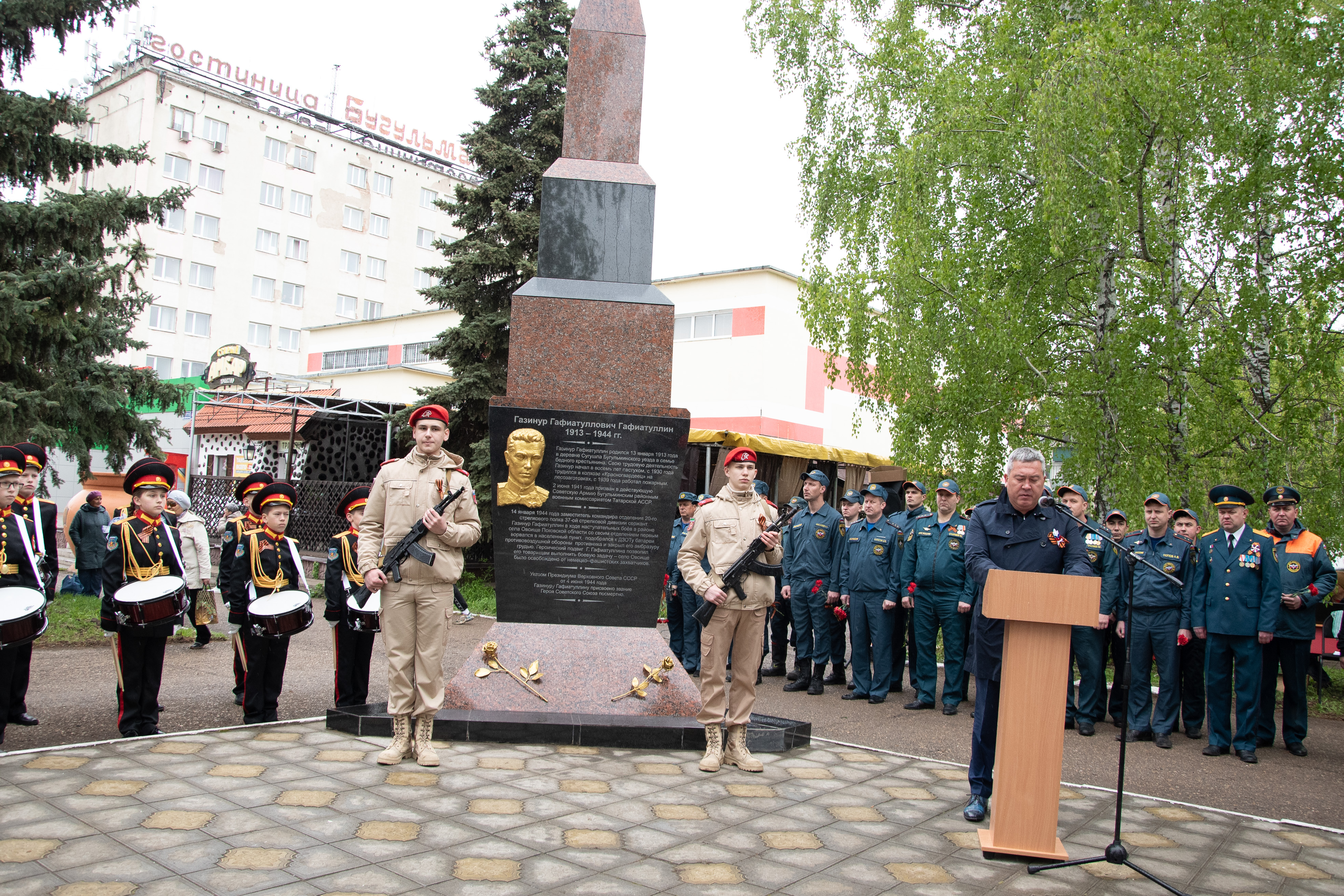 Накануне 79-й годовщины Победы советского народа в Великой Отечественной войне в Бугульме у Стелы Газинуру Гафиатуллину состоялся торжественный митинг. Кадеты, сотрудники МЧС, представители местной власти, школьники почтили память пожарного, Героя Советского Союза Газинура Гафиатуллина.