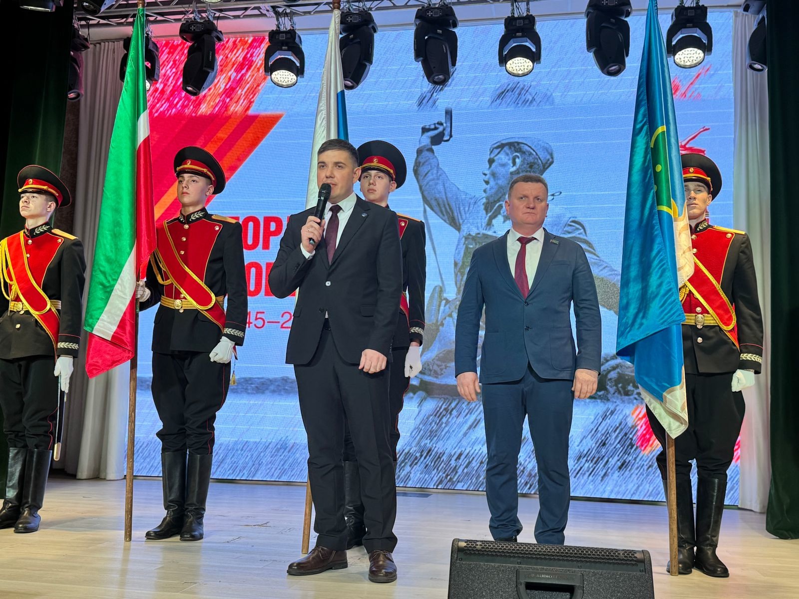 Перед началом концерта под марш и бой барабанов учащиеся кадетской школы №82 ГСС И. Маннанова вынесли флаги РФ и РТ.