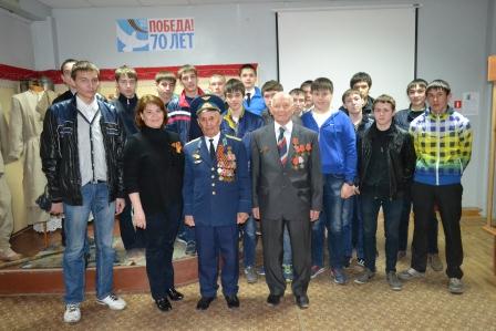 7.05.2015 в Азнакаевском краеведческом музее прошло мероприятие под названием «Знамя- символ Победы». На мероприятие были приглашены Гаптелхаков Миннехуза Гаптелхакович – участник событий в Венгрии и Чехословакии и Тюрин Михаил Александрович – труженик тыла. В первой части мероприятия для аудитории слушателей (Учащиеся Лениногорского техникума) была представлена информация о событиях 70 летней давности - версии водружения Знамени Победы над Рейхстагом. Текст сопровождался показом презентации на эту тему. И тема Знамени Победы и выступление гостей были выслушаны аудиторией с большим вниманием и интересом. Ребята тепло отозвались о ветеранах и поблагодарили их за выступление. Мероприятие подготовила и провела Мусина Р.К.