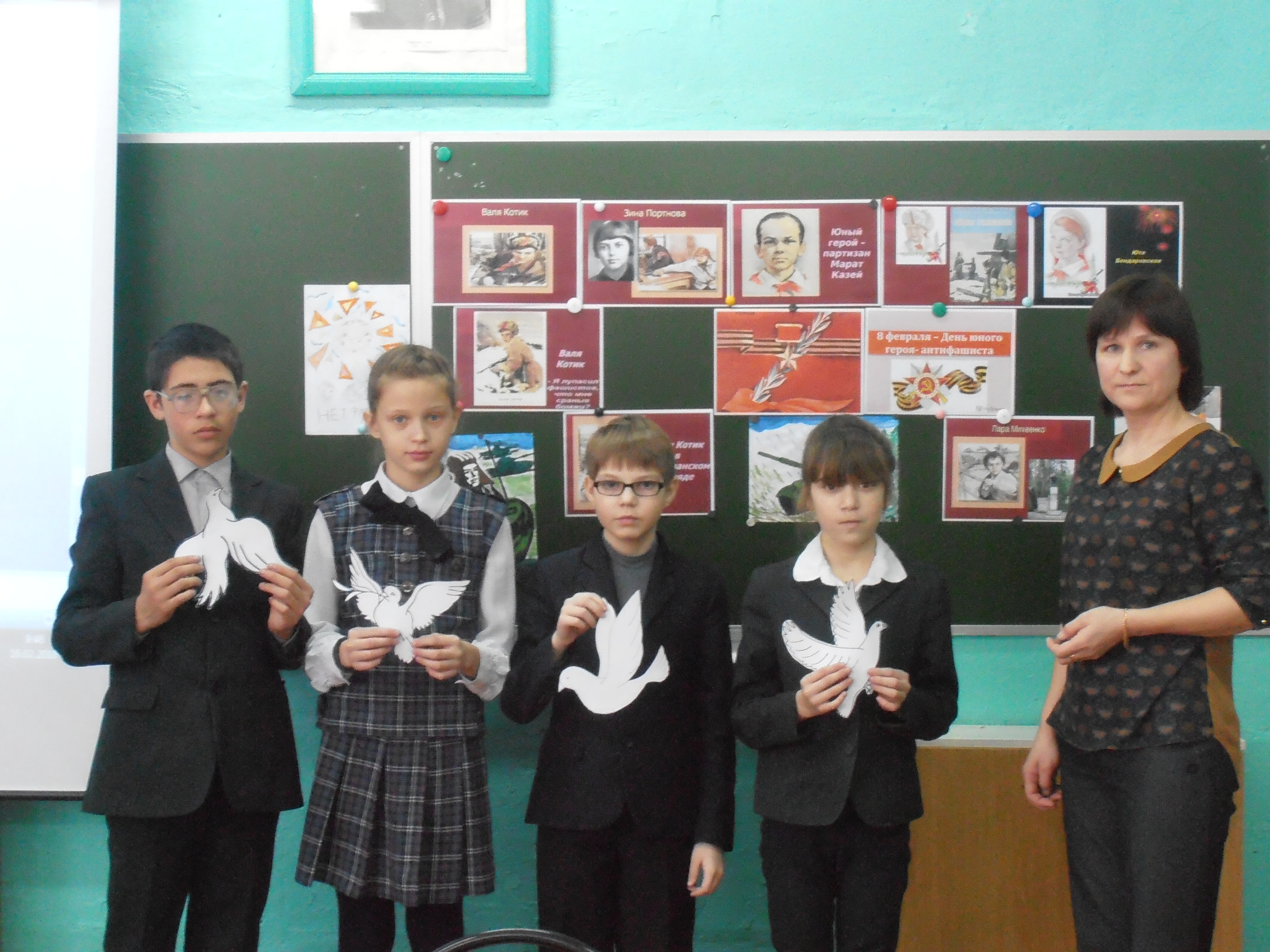 16 февраля прошел открытый классный час в 5 классе. Классный руководитель Ахметвалеева Г.С. подготовила и провела классный час на тему «Маленькие герои большой войны», где она рассказала ребятам о подвигах детей в годы войны. Ребята познакомились с такими именами , как Марат Казей, Валя Котик, Зина Портнова, Лара Михеенко и другими. Информация, содержащаяся в сообщении учителя, - богатая, интересная, соответствует возрасту учащихся. В конце классного часа была выполнена творческая работа - ребята вырезали голубей, символ мира и добра, и прикрепляли их на доску.