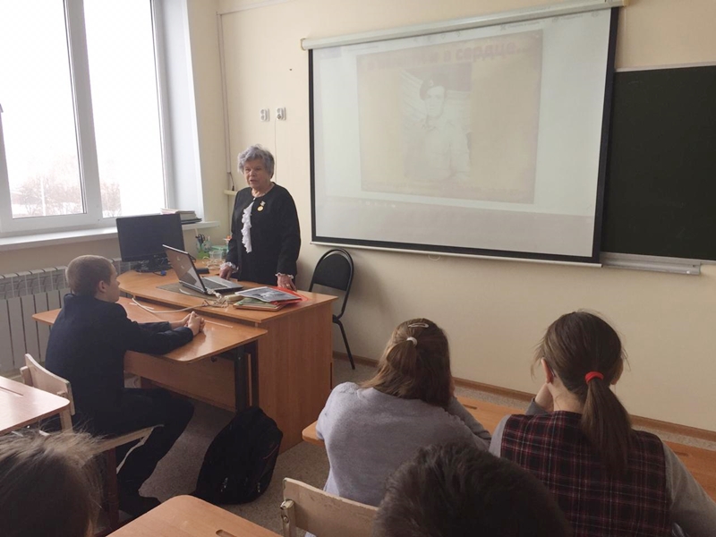 Трофимова В.А. познакомила детей со школьной жизнью и героической гибелью в Афганистане ее ученика, Потапова Андрея. Она показала презентацию с фотографиями, письмами и документами Потапова А. Н.