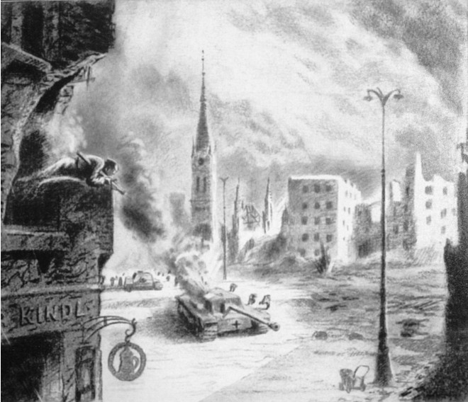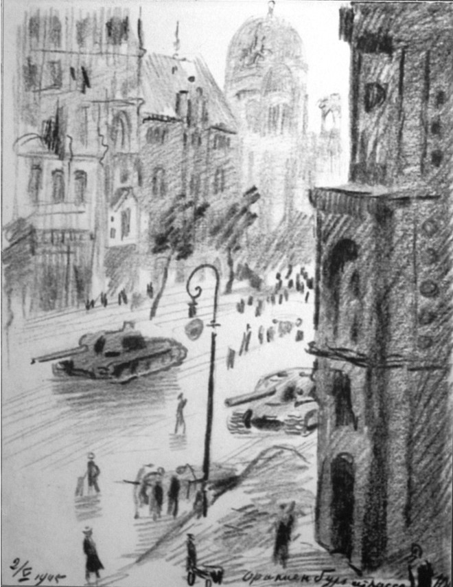 В последние дни перед Великой Победой Цишевский рисовал каждый день и датировал свои работы – 17 апреля, 2, 3 и 9 мая. Особый интерес он проявлял к самим боям и их последствиям. На некоторых работах видны раненые солдаты, трамваи, которые до последних дней ходили по Берлину.